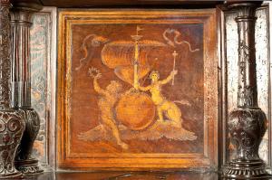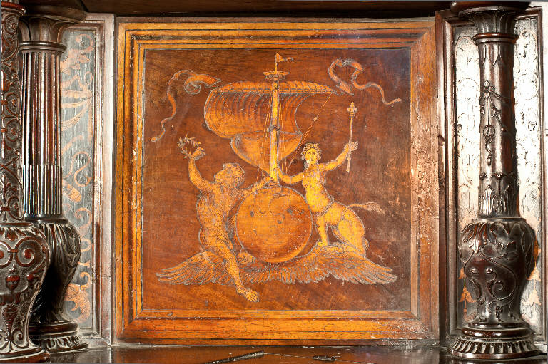 - NOTIZIE STORICO CRITICHE Nel 1522 il Consorzio della Misericordia Maggiore di Bergamo decise di dotare la basilica di Santa Maria di un nuovo coro confacente alla progettata pala d'argento e rame dell'altare maggiore e il 18 settembre di quell'anno deliberò di trattare con il legnaiolo e intarsiatore loverese Giovanni Francesco Capoferri per l'esecuzione dell'opera. L'artefice era noto a Bergamo fin dall'anno precedente per aver collaborato con fra' Damiano Zambelli all'esecuzione del coro intarsiato nella chiesa domenicana di Santo Stefano (ora in San Bartolomeo), inoltre il pittore Lorenzo Lotto gli aveva fatto tradurre in tarsia un suo disegno dell'Annunciazione (poi inserita nel bancale del celebrante, cfr. foto n. 904a) e questa dimostrazione aveva convinto il Consorzio ad affidare il lavoro al loverese. Al Capoferri, direttore dell'impresa del coro, fu affiancato il marangone Giovanni Belli di Ponteranica per i lavori di intaglio. Il principale teologo della città, fra Girolamo Terzi, fu incaricato di fornire le "inventiones" da dare ai pittori che avrebbero disegnato i cartoni da intarsiare. Il progetto della struttura del coro fu messo a punto dallo stesso Capoferri che visitò varie città del Nord-Italia per vedere altri cori intarsiati e che nel luglio-agosto 1523 si recò più volte a Milano dal pittore e architetto trevigliese Bernardo Zenale per sottoporgli il modello del coro. \nDopo aver acquisito alcuni cartoni forniti da pittori diversi, tra cui Lotto, Andrea Previtali, Francesco Rosso di Pavia, il 29 ottobre 1523 il Consorzio affidò i cartoni delle tarsie del coro al pittore bergamasco Nicolino Cabrini, di cui non si conosce nessuna opera se non la profilatura di alcune tarsie e che morì poco dopo, nel gennaio del 1524. Il 12 marzo 1524 il Consorzio incaricò dunque Lorenzo Lotto di eseguire i disegni per le tarsie da inserire negli schienali del coro ligneo della chiesa; dopo pochi mesi (2 giugno 1524) gli commissionò anche i pannelli intarsiati ("coperti") che dovevano proteggere le preziose tavolette. Le tarsie principali sarebbero state policrome, mentre i coperti a monocromo: questi ultimi avrebbero avuto come ornamento immagini simboliche in relazione coi contenuti delle "storie" da proteggere. Lotto inizialmente effettuò anche la 'profilatura' delle tarsie, ovvero la loro rifinitura finale mediante stucco nero per i contorni delle figure e con ombreggiatura a fuoco per il chiaro-scuro, ma un contrasto di natura economica frenò la sua disponibilità: il Consorzio gli riconobbe un compenso maggiore per le tarsie grandi dell'iconostasi. La profilatura fu allora effettuata dallo stesso Capoferri e dai pittori Andrea Previtali, Ludovico da Mantova e Lucano da Imola. Trasferitosi a Venezia nel dicembre del 1525, il pittore continuò a disegnare i cartoni delle tarsie e a inviarle a Bergamo fino al 1532, realizzando complessivamente 35 tarsie con storie bibliche di cui 4 grandi per l'iconostasi e 31 più piccole collocate oggi negli stalli del coro dei laici e nei due bancali del presbiterio; inoltre eseguì 32 tarsie a soggetto simbolico delle quali 28 costituivano i "coperti" delle tarsie istoriate e che oggi sono inserite negli schienali del coro degli ecclesiastici. \nNel 1531 si decise di ampliare la struttura del coro, trasferendo le tarsie istoriate ai due bancali dei celebranti e dei Rettori e al coro dei laici nell'abside, mentre nel coro degli ecclesistici rimasero i soli 'coperti' di soggetto simbolico. Solo i grandi quadri istoriati nel fronte dell'iconostasi rimasero con i loro coperti nella collocazione originaria. Nell'ottobre del 1533, consegnati dal Capoferri gli ultimi pannelli intarsiati, risultano già collocate negli stalli del coro dei religiosi le tarsie 'simboliche' degli ex-coperti, mentre le altre tarsie istoriate sarebbero rimaste per vent'anni nei depositi della Misericordia Maggiore.\nLa tarsia in oggetto, pensata come coperto della tarsia con "Ester e Assuero" (poi inserita nel coro dei laici), fu disegnata da Lo