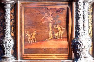 - NOTIZIE STORICO CRITICHE Nel 1522 il Consorzio della Misericordia Maggiore di Bergamo decise di dotare la basilica di Santa Maria di un nuovo coro confacente alla progettata pala d'argento e rame dell'altare maggiore e il 18 settembre di quell'anno deliberò di trattare con il legnaiolo e intarsiatore loverese Giovanni Francesco Capoferri per l'esecuzione dell'opera. L'artefice era noto a Bergamo fin dall'anno precedente per aver collaborato con fra' Damiano Zambelli all'esecuzione del coro intarsiato nella chiesa domenicana di Santo Stefano (ora in San Bartolomeo), inoltre il pittore Lorenzo Lotto gli aveva fatto tradurre in tarsia un suo disegno dell'Annunciazione (poi inserita nel bancale del celebrante, cfr. foto n. 904a) e questa dimostrazione aveva convinto il Consorzio ad affidare il lavoro al loverese. Al Capoferri, direttore dell'impresa del coro, fu affiancato il marangone Giovanni Belli di Ponteranica per i lavori di intaglio. Il principale teologo della città, fra Girolamo Terzi, fu incaricato di fornire le "inventiones" da dare ai pittori che avrebbero disegnato i cartoni da intarsiare. Il progetto della struttura del coro fu messo a punto dallo stesso Capoferri che visitò varie città del Nord-Italia per vedere altri cori intarsiati e che nel luglio-agosto 1523 si recò più volte a Milano dal pittore e architetto trevigliese Bernardo Zenale per sottoporgli il modello del coro. \nDopo aver acquisito alcuni cartoni forniti da pittori diversi, tra cui Lotto, Andrea Previtali, Francesco Rosso di Pavia, il 29 ottobre 1523 il Consorzio affidò i cartoni delle tarsie del coro al pittore bergamasco Nicolino Cabrini, di cui non si conosce nessuna opera se non la profilatura di alcune tarsie e che morì poco dopo, nel gennaio del 1524. Il 12 marzo 1524 il Consorzio incaricò dunque Lorenzo Lotto di eseguire i disegni per le tarsie da inserire negli schienali del coro ligneo della chiesa; dopo pochi mesi (2 giugno 1524) gli commissionò anche i pannelli intarsiati ("coperti") che dovevano proteggere le preziose tavolette. Le tarsie principali sarebbero state policrome, mentre i coperti a monocromo: questi ultimi avrebbero avuto come ornamento immagini simboliche in relazione coi contenuti delle "storie" da proteggere. Lotto inizialmente effettuò anche la 'profilatura' delle tarsie, ovvero la loro rifinitura finale mediante stucco nero per i contorni delle figure e con ombreggiatura a fuoco per il chiaro-scuro, ma un contrasto di natura economica frenò la sua disponibilità: il Consorzio gli riconobbe un compenso maggiore per le tarsie grandi dell'iconostasi. La profilatura fu allora effettuata dallo stesso Capoferri e dai pittori Andrea Previtali, Ludovico da Mantova e Lucano da Imola. Trasferitosi a Venezia nel dicembre del 1525, il pittore continuò a disegnare i cartoni delle tarsie e a inviarle a Bergamo fino al 1532, realizzando complessivamente 35 tarsie con storie bibliche di cui 4 grandi per l'iconostasi e 31 più piccole collocate oggi negli stalli del coro dei laici e nei due bancali del presbiterio; inoltre eseguì 32 tarsie a soggetto simbolico delle quali 28 costituivano i "coperti" delle tarsie istoriate e che oggi sono inserite negli schienali del coro degli ecclesiastici. \nNel 1531 si decise di ampliare la struttura del coro, trasferendo le tarsie istoriate ai due bancali dei celebranti e dei Rettori e al coro dei laici nell'abside, mentre nel coro degli ecclesistici rimasero i soli 'coperti' di soggetto simbolico. Solo i grandi quadri istoriati nel fronte dell'iconostasi rimasero con i loro coperti nella collocazione originaria. Nell'ottobre del 1533, consegnati dal Capoferri gli ultimi pannelli intarsiati, risultano già collocate negli stalli del coro dei religiosi le tarsie 'simboliche' degli ex-coperti, mentre le altre tarsie istoriate sarebbero rimaste per vent'anni nei depositi della Misericordia Maggiore.\nLa tarsia in oggetto fu ideata da Lotto nel 1527 come coperto della tarsia con "David che esce da Gerusalemme con l'Arca dell'Allea