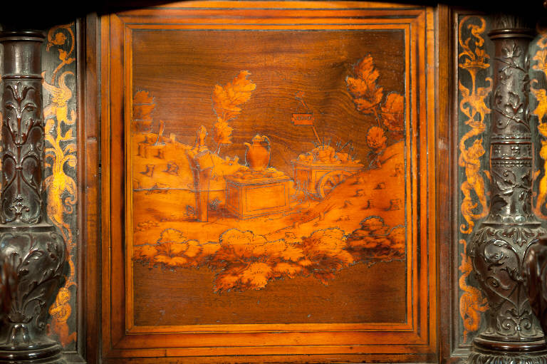 - NOTIZIE STORICO CRITICHE Nel 1522 il Consorzio della Misericordia Maggiore di Bergamo decise di dotare la basilica di Santa Maria di un nuovo coro confacente alla progettata pala d'argento e rame dell'altare maggiore e il 18 settembre di quell'anno deliberò di trattare con il legnaiolo e intarsiatore loverese Giovanni Francesco Capoferri per l'esecuzione dell'opera. L'artefice era noto a Bergamo fin dall'anno precedente per aver collaborato con fra' Damiano Zambelli all'esecuzione del coro intarsiato nella chiesa domenicana di Santo Stefano (ora in San Bartolomeo), inoltre il pittore Lorenzo Lotto gli aveva fatto tradurre in tarsia un suo disegno dell'Annunciazione (poi inserita nel bancale del celebrante, cfr. foto n. 904a) e questa dimostrazione aveva convinto il Consorzio ad affidare il lavoro al loverese. Al Capoferri, direttore dell'impresa del coro, fu affiancato il marangone Giovanni Belli di Ponteranica per i lavori di intaglio. Il principale teologo della città, fra Girolamo Terzi, fu incaricato di fornire le "inventiones" da dare ai pittori che avrebbero disegnato i cartoni da intarsiare. Il progetto della struttura del coro fu messo a punto dallo stesso Capoferri che visitò varie città del Nord-Italia per vedere altri cori intarsiati e che nel luglio-agosto 1523 si recò più volte a Milano dal pittore e architetto trevigliese Bernardo Zenale per sottoporgli il modello del coro. \nDopo aver acquisito alcuni cartoni forniti da pittori diversi, tra cui Lotto, Andrea Previtali, Francesco Rosso di Pavia, il 29 ottobre 1523 il Consorzio affidò i cartoni delle tarsie del coro al pittore bergamasco Nicolino Cabrini, di cui non si conosce nessuna opera se non la profilatura di alcune tarsie e che morì poco dopo, nel gennaio del 1524. Il 12 marzo 1524 il Consorzio incaricò dunque Lorenzo Lotto di eseguire i disegni per le tarsie da inserire negli schienali del coro ligneo della chiesa; dopo pochi mesi (2 giugno 1524) gli commissionò anche i pannelli intarsiati ("coperti") che dovevano proteggere le preziose tavolette. Le tarsie principali sarebbero state policrome, mentre i coperti a monocromo: questi ultimi avrebbero avuto come ornamento immagini simboliche in relazione coi contenuti delle "storie" da proteggere. Lotto inizialmente effettuò anche la 'profilatura' delle tarsie, ovvero la loro rifinitura finale mediante stucco nero per i contorni delle figure e con ombreggiatura a fuoco per il chiaro-scuro, ma un contrasto di natura economica frenò la sua disponibilità: il Consorzio gli riconobbe un compenso maggiore per le tarsie grandi dell'iconostasi. La profilatura fu allora effettuata dallo stesso Capoferri e dai pittori Andrea Previtali, Ludovico da Mantova e Lucano da Imola. Trasferitosi a Venezia nel dicembre del 1525, il pittore continuò a disegnare i cartoni delle tarsie e a inviarle a Bergamo fino al 1532, realizzando complessivamente 35 tarsie con storie bibliche di cui 4 grandi per l'iconostasi e 31 più piccole collocate oggi negli stalli del coro dei laici e nei due bancali del presbiterio; inoltre eseguì 32 tarsie a soggetto simbolico delle quali 28 costituivano i "coperti" delle tarsie istoriate e che oggi sono inserite negli schienali del coro degli ecclesiastici. \nNel 1531 si decise di ampliare la struttura del coro, trasferendo le tarsie istoriate ai due bancali dei celebranti e dei Rettori e al coro dei laici nell'abside, mentre nel coro degli ecclesistici rimasero i soli 'coperti' di soggetto simbolico. Solo i grandi quadri istoriati nel fronte dell'iconostasi rimasero con i loro coperti nella collocazione originaria. Nell'ottobre del 1533, consegnati dal Capoferri gli ultimi pannelli intarsiati, risultano già collocate negli stalli del coro dei religiosi le tarsie 'simboliche' degli ex-coperti, mentre le altre tarsie istoriate sarebbero rimaste per vent'anni nei depositi della Misericordia Maggiore.\nLa tarsia in oggetto fu ideata da Lotto nel 1531 come coperto della tarsia con il "Sacrificio di Melchisedek" (poi inserita nel cor