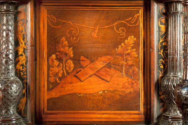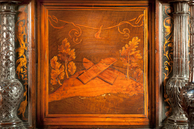 - NOTIZIE STORICO CRITICHE Nel 1522 il Consorzio della Misericordia Maggiore di Bergamo decise di dotare la basilica di Santa Maria di un nuovo coro confacente alla progettata pala d'argento e rame dell'altare maggiore e il 18 settembre di quell'anno deliberò di trattare con il legnaiolo e intarsiatore loverese Giovanni Francesco Capoferri per l'esecuzione dell'opera. L'artefice era noto a Bergamo fin dall'anno precedente per aver collaborato con fra' Damiano Zambelli all'esecuzione del coro intarsiato nella chiesa domenicana di Santo Stefano (ora in San Bartolomeo), inoltre il pittore Lorenzo Lotto gli aveva fatto tradurre in tarsia un suo disegno dell'Annunciazione (poi inserita nel bancale del celebrante, cfr. foto n. 904a) e questa dimostrazione aveva convinto il Consorzio ad affidare il lavoro al loverese. Al Capoferri, direttore dell'impresa del coro, fu affiancato il marangone Giovanni Belli di Ponteranica per i lavori di intaglio. Il principale teologo della città, fra Girolamo Terzi, fu incaricato di fornire le "inventiones" da dare ai pittori che avrebbero disegnato i cartoni da intarsiare. Il progetto della struttura del coro fu messo a punto dallo stesso Capoferri che visitò varie città del Nord-Italia per vedere altri cori intarsiati e che nel luglio-agosto 1523 si recò più volte a Milano dal pittore e architetto trevigliese Bernardo Zenale per sottoporgli il modello del coro. \nDopo aver acquisito alcuni cartoni forniti da pittori diversi, tra cui Lotto, Andrea Previtali, Francesco Rosso di Pavia, il 29 ottobre 1523 il Consorzio affidò i cartoni delle tarsie del coro al pittore bergamasco Nicolino Cabrini, di cui non si conosce nessuna opera se non la profilatura di alcune tarsie e che morì poco dopo, nel gennaio del 1524. Il 12 marzo 1524 il Consorzio incaricò dunque Lorenzo Lotto di eseguire i disegni per le tarsie da inserire negli schienali del coro ligneo della chiesa; dopo pochi mesi (2 giugno 1524) gli commissionò anche i pannelli intarsiati ("coperti") che dovevano proteggere le preziose tavolette. Le tarsie principali sarebbero state policrome, mentre i coperti a monocromo: questi ultimi avrebbero avuto come ornamento immagini simboliche in relazione coi contenuti delle "storie" da proteggere. Lotto inizialmente effettuò anche la 'profilatura' delle tarsie, ovvero la loro rifinitura finale mediante stucco nero per i contorni delle figure e con ombreggiatura a fuoco per il chiaro-scuro, ma un contrasto di natura economica frenò la sua disponibilità: il Consorzio gli riconobbe un compenso maggiore per le tarsie grandi dell'iconostasi. La profilatura fu allora effettuata dallo stesso Capoferri e dai pittori Andrea Previtali, Ludovico da Mantova e Lucano da Imola. Trasferitosi a Venezia nel dicembre del 1525, il pittore continuò a disegnare i cartoni delle tarsie e a inviarle a Bergamo fino al 1532, realizzando complessivamente 35 tarsie con storie bibliche di cui 4 grandi per l'iconostasi e 31 più piccole collocate oggi negli stalli del coro dei laici e nei due bancali del presbiterio; inoltre eseguì 32 tarsie a soggetto simbolico delle quali 28 costituivano i "coperti" delle tarsie istoriate e che oggi sono inserite negli schienali del coro degli ecclesiastici. \nNel 1531 si decise di ampliare la struttura del coro, trasferendo le tarsie istoriate ai due bancali dei celebranti e dei Rettori e al coro dei laici nell'abside, mentre nel coro degli ecclesistici rimasero i soli 'coperti' di soggetto simbolico. Solo i grandi quadri istoriati nel fronte dell'iconostasi rimasero con i loro coperti nella collocazione originaria. Nell'ottobre del 1533, consegnati dal Capoferri gli ultimi pannelli intarsiati, risultano già collocate negli stalli del coro dei religiosi le tarsie 'simboliche' degli ex-coperti, mentre le altre tarsie istoriate sarebbero rimaste per vent'anni nei depositi della Misericordia Maggiore.\nLa tarsia in oggetto fu ideata da Lotto nel 1530/1531 come coperto della tarsia con "Sansone che uccide i Filistei con la mascella