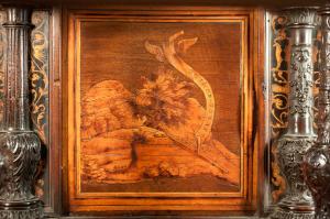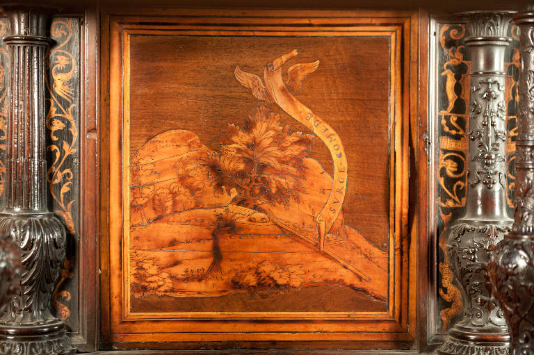 - NOTIZIE STORICO CRITICHE Nel 1522 il Consorzio della Misericordia Maggiore di Bergamo decise di dotare la basilica di Santa Maria di un nuovo coro confacente alla progettata pala d'argento e rame dell'altare maggiore e il 18 settembre di quell'anno deliberò di trattare con il legnaiolo e intarsiatore loverese Giovanni Francesco Capoferri per l'esecuzione dell'opera. L'artefice era noto a Bergamo fin dall'anno precedente per aver collaborato con fra' Damiano Zambelli all'esecuzione del coro intarsiato nella chiesa domenicana di Santo Stefano (ora in San Bartolomeo), inoltre il pittore Lorenzo Lotto gli aveva fatto tradurre in tarsia un suo disegno dell'Annunciazione (poi inserita nel bancale del celebrante, cfr. foto n. 904a) e questa dimostrazione aveva convinto il Consorzio ad affidare il lavoro al loverese. Al Capoferri, direttore dell'impresa del coro, fu affiancato il marangone Giovanni Belli di Ponteranica per i lavori di intaglio. Il principale teologo della città, fra Girolamo Terzi, fu incaricato di fornire le "inventiones" da dare ai pittori che avrebbero disegnato i cartoni da intarsiare. Il progetto della struttura del coro fu messo a punto dallo stesso Capoferri che visitò varie città del Nord-Italia per vedere altri cori intarsiati e che nel luglio-agosto 1523 si recò più volte a Milano dal pittore e architetto trevigliese Bernardo Zenale per sottoporgli il modello del coro. \nDopo aver acquisito alcuni cartoni forniti da pittori diversi, tra cui Lotto, Andrea Previtali, Francesco Rosso di Pavia, il 29 ottobre 1523 il Consorzio affidò i cartoni delle tarsie del coro al pittore bergamasco Nicolino Cabrini, di cui non si conosce nessuna opera se non la profilatura di alcune tarsie e che morì poco dopo, nel gennaio del 1524. Il 12 marzo 1524 il Consorzio incaricò dunque Lorenzo Lotto di eseguire i disegni per le tarsie da inserire negli schienali del coro ligneo della chiesa; dopo pochi mesi (2 giugno 1524) gli commissionò anche i pannelli intarsiati ("coperti") che dovevano proteggere le preziose tavolette. Le tarsie principali sarebbero state policrome, mentre i coperti a monocromo: questi ultimi avrebbero avuto come ornamento immagini simboliche in relazione coi contenuti delle "storie" da proteggere. Lotto inizialmente effettuò anche la 'profilatura' delle tarsie, ovvero la loro rifinitura finale mediante stucco nero per i contorni delle figure e con ombreggiatura a fuoco per il chiaro-scuro, ma un contrasto di natura economica frenò la sua disponibilità: il Consorzio gli riconobbe un compenso maggiore per le tarsie grandi dell'iconostasi. La profilatura fu allora effettuata dallo stesso Capoferri e dai pittori Andrea Previtali, Ludovico da Mantova e Lucano da Imola. Trasferitosi a Venezia nel dicembre del 1525, il pittore continuò a disegnare i cartoni delle tarsie e a inviarle a Bergamo fino al 1532, realizzando complessivamente 35 tarsie con storie bibliche di cui 4 grandi per l'iconostasi e 31 più piccole collocate oggi negli stalli del coro dei laici e nei due bancali del presbiterio; inoltre eseguì 32 tarsie a soggetto simbolico delle quali 28 costituivano i "coperti" delle tarsie istoriate e che oggi sono inserite negli schienali del coro degli ecclesiastici. \nNel 1531 si decise di ampliare la struttura del coro, trasferendo le tarsie istoriate ai due bancali dei celebranti e dei Rettori e al coro dei laici nell'abside, mentre nel coro degli ecclesistici rimasero i soli 'coperti' di soggetto simbolico. Solo i grandi quadri istoriati nel fronte dell'iconostasi rimasero con i loro coperti nella collocazione originaria. Nell'ottobre del 1533, consegnati dal Capoferri gli ultimi pannelli intarsiati, risultano già collocate negli stalli del coro dei religiosi le tarsie 'simboliche' degli ex-coperti, mentre le altre tarsie istoriate sarebbero rimaste per vent'anni nei depositi della Misericordia Maggiore.\nLa tarsia in oggetto fu ideata da Lotto entro il gennaio 1531 come coperto della tarsia con "Elia che fugge Gezabele" (poi inserita