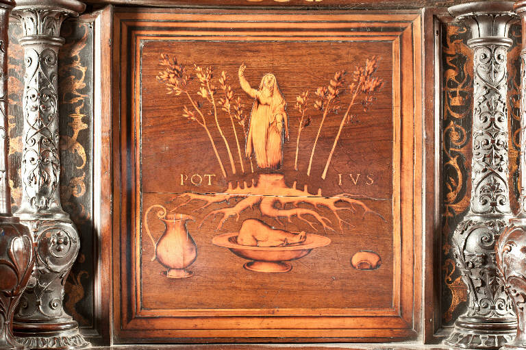 - NOTIZIE STORICO CRITICHE Nel 1522 il Consorzio della Misericordia Maggiore di Bergamo decise di dotare la basilica di Santa Maria di un nuovo coro confacente alla progettata pala d'argento e rame dell'altare maggiore e il 18 settembre di quell'anno deliberò di trattare con il legnaiolo e intarsiatore loverese Giovanni Francesco Capoferri per l'esecuzione dell'opera. L'artefice era noto a Bergamo fin dall'anno precedente per aver collaborato con fra' Damiano Zambelli all'esecuzione del coro intarsiato nella chiesa domenicana di Santo Stefano (ora in San Bartolomeo), inoltre il pittore Lorenzo Lotto gli aveva fatto tradurre in tarsia un suo disegno dell'Annunciazione (poi inserita nel bancale del celebrante, cfr. foto n. 904a) e questa dimostrazione aveva convinto il Consorzio ad affidare il lavoro al loverese. Al Capoferri, direttore dell'impresa del coro, fu affiancato il marangone Giovanni Belli di Ponteranica per i lavori di intaglio. Il principale teologo della città, fra Girolamo Terzi, fu incaricato di fornire le "inventiones" da dare ai pittori che avrebbero disegnato i cartoni da intarsiare. Il progetto della struttura del coro fu messo a punto dallo stesso Capoferri che visitò varie città del Nord-Italia per vedere altri cori intarsiati e che nel luglio-agosto 1523 si recò più volte a Milano dal pittore e architetto trevigliese Bernardo Zenale per sottoporgli il modello del coro. \nDopo aver acquisito alcuni cartoni forniti da pittori diversi, tra cui Lotto, Andrea Previtali, Francesco Rosso di Pavia, il 29 ottobre 1523 il Consorzio affidò i cartoni delle tarsie del coro al pittore bergamasco Nicolino Cabrini, di cui non si conosce nessuna opera se non la profilatura di alcune tarsie e che morì poco dopo, nel gennaio del 1524. Il 12 marzo 1524 il Consorzio incaricò dunque Lorenzo Lotto di eseguire i disegni per le tarsie da inserire negli schienali del coro ligneo della chiesa; dopo pochi mesi (2 giugno 1524) gli commissionò anche i pannelli intarsiati ("coperti") che dovevano proteggere le preziose tavolette. Le tarsie principali sarebbero state policrome, mentre i coperti a monocromo: questi ultimi avrebbero avuto come ornamento immagini simboliche in relazione coi contenuti delle "storie" da proteggere. Lotto inizialmente effettuò anche la 'profilatura' delle tarsie, ovvero la loro rifinitura finale mediante stucco nero per i contorni delle figure e con ombreggiatura a fuoco per il chiaro-scuro, ma un contrasto di natura economica frenò la sua disponibilità: il Consorzio gli riconobbe un compenso maggiore per le tarsie grandi dell'iconostasi. La profilatura fu allora effettuata dallo stesso Capoferri e dai pittori Andrea Previtali, Ludovico da Mantova e Lucano da Imola. Trasferitosi a Venezia nel dicembre del 1525, il pittore continuò a disegnare i cartoni delle tarsie e a inviarle a Bergamo fino al 1532, realizzando complessivamente 35 tarsie con storie bibliche di cui 4 grandi per l'iconostasi e 31 più piccole collocate oggi negli stalli del coro dei laici e nei due bancali del presbiterio; inoltre eseguì 32 tarsie a soggetto simbolico delle quali 28 costituivano i "coperti" delle tarsie istoriate e che oggi sono inserite negli schienali del coro degli ecclesiastici. \nNel 1531 si decise di ampliare la struttura del coro, trasferendo le tarsie istoriate ai due bancali dei celebranti e dei Rettori e al coro dei laici nell'abside, mentre nel coro degli ecclesistici rimasero i soli 'coperti' di soggetto simbolico. Solo i grandi quadri istoriati nel fronte dell'iconostasi rimasero con i loro coperti nella collocazione originaria. Nell'ottobre del 1533, consegnati dal Capoferri gli ultimi pannelli intarsiati, risultano già collocate negli stalli del coro dei religiosi le tarsie 'simboliche' degli ex-coperti, mentre le altre tarsie istoriate sarebbero rimaste per vent'anni nei depositi della Misericordia Maggiore.\nLa tarsia in oggetto fu ideata da Lotto entro il marzo 1525, prima della partenza per Venezia, come coperto della tarsia con la "Ma
