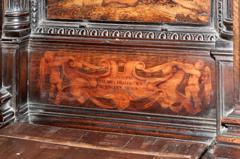 - NOTIZIE STORICO CRITICHE Nel 1522 il Consorzio della Misericordia Maggiore di Bergamo decise di dotare la basilica di Santa Maria di un nuovo coro e il 18 settembre di quell'anno deliberò di trattare con il legnaiolo e intarsiatore loverese Giovanni Francesco Capoferri per l'esecuzione dell'opera. L'artefice era noto a Bergamo fin dall'anno precedente per aver collaborato con fra' Damiano Zambelli all'esecuzione del coro intarsiato nella chiesa domenicana di Santo Stefano (ora in San Bartolomeo), inoltre nel 1522 il pittore Lorenzo Lotto gli aveva fatto tradurre in tarsia un suo disegno dell'Annunciazione (poi inserita nel bancale del celebrante, cfr. foto n. 904a) e questa dimostrazione aveva convinto il Consorzio ad affidare il lavoro al loverese. Al Capoferri, direttore dell'impresa del coro, fu affiancato il marangone Giovanni Belli di Ponteranica per i lavori di intaglio. Il principale teologo della città, fra Girolamo Terzi, fu incaricato di fornire le "inventiones" da dare ai pittori che avrebbero disegnato i cartoni da intarsiare.\nDopo aver acquisito alcuni cartoni forniti da pittori diversi, tra cui Lotto, Andrea Previtali, Francesco Rosso di Pavia, il 29 ottobre 1523 il Consorzio affidò i cartoni delle tarsie del coro al pressoché sconosciuto Nicolino Cabrini, che morì poco dopo. Il 12 marzo 1524 il Consorzio incaricò dunque Lorenzo Lotto di eseguire i disegni per le tarsie e dopo pochi mesi (2 giugno 1524) gli commissionò anche i pannelli intarsiati ("coperti") con imprese simboliche che dovevano proteggere le preziose tavolette. Lotto inizialmente effettuò anche la 'profilatura' delle tarsie, ovvero la loro rifinitura finale mediante stucco nero per i contorni delle figure e con ombreggiatura a fuoco per il chiaro-scuro, ma un contrasto di natura economica frenò la sua disponibilità. La profilatura fu allora effettuata dallo stesso Capoferri e dai pittori Andrea Previtali, Ludovico da Mantova e Lucano da Imola. Trasferitosi a Venezia nel dicembre del 1525, il pittore continuò a disegnare i cartoni delle tarsie e a inviarle a Bergamo fino al 1532, realizzando complessivamente 35 tarsie con storie bibliche di cui 4 grandi per l'iconostasi e 31 più piccole collocate oggi negli stalli del coro dei laici e nei due bancali del presbiterio; inoltre eseguì 32 tarsie a soggetto simbolico delle quali 28 costituivano i "coperti" delle tarsie istoriate e che oggi sono inserite negli schienali del coro degli ecclesiastici. \nNel 1531 si decise di ampliare la struttura del coro, trasferendo le tarsie istoriate del coro degli ecclesiastici al bancale del celebrante, a quello dei Rettori e al coro dei laici nell'abside, mentre nel coro dei religiosi rimasero i soli 'coperti' di soggetto simbolico: dei modelletti delle nuove strutture del presbiterio (bancali e coro dei laici) fu incaricato Marcantonio, figlio dell'architetto Pietro Isabello (1531-1532). Nell'ottobre del 1533, consegnati dal Capoferri gli ultimi pannelli intarsiati, risultano già collocate negli stalli del coro dei religiosi le tarsie 'simboliche' degli ex-coperti, mentre le altre tarsie istoriate rimasero per vent'anni nei depositi della Misericordia Maggiore. La fabbrica del coro fu ripresa nel 1547-1549 ma solo nel 1553-1555 i banchi della cappella maggiore furono portati a termine in base al modello elaborato dall'Isabello: nel 1553 fu chiamato a Bergamo Giovan Pietro Capoferri, fratellastro di Giovan Francesco, affermato intagliatore e intarsiatore, per la realizzazione del bancale del celebrante e della parte sinistra del coro dei laici, mentre ad Alessandro Belli, già attivo col padre nel coro degli ecclesiastici, furono assegnati il bancale dei Rettori e la parte destra del coro dei laici. Nel luglio del 1554 il bancale del celebrante era quasi del tutto intagliato, giacché fu acquistato il noce per la cimasa intagliata da Giovan Pietro Capoferri. Nelle tre spalliere furono inserite sei tarsie disegnate da Lotto e realizzate da Giovan Francesco Capoferri illustranti episodi della
