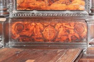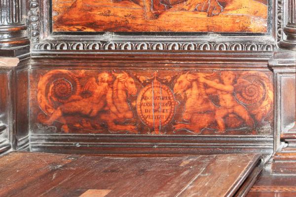 - NOTIZIE STORICO CRITICHE Nel 1522 il Consorzio della Misericordia Maggiore di Bergamo decise di dotare la basilica di Santa Maria di un nuovo coro e il 18 settembre di quell'anno deliberò di trattare con il legnaiolo e intarsiatore loverese Giovanni Francesco Capoferri per l'esecuzione dell'opera. L'artefice era noto a Bergamo fin dall'anno precedente per aver collaborato con fra' Damiano Zambelli all'esecuzione del coro intarsiato nella chiesa domenicana di Santo Stefano (ora in San Bartolomeo), inoltre nel 1522 il pittore Lorenzo Lotto gli aveva fatto tradurre in tarsia un suo disegno dell'Annunciazione (poi inserita nel bancale del celebrante, cfr. foto n. 904a) e questa dimostrazione aveva convinto il Consorzio ad affidare il lavoro al loverese. Al Capoferri, direttore dell'impresa del coro, fu affiancato il marangone Giovanni Belli di Ponteranica per i lavori di intaglio. Il principale teologo della città, fra Girolamo Terzi, fu incaricato di fornire le "inventiones" da dare ai pittori che avrebbero disegnato i cartoni da intarsiare.\nDopo aver acquisito alcuni cartoni forniti da pittori diversi, tra cui Lotto, Andrea Previtali, Francesco Rosso di Pavia, il 29 ottobre 1523 il Consorzio affidò i cartoni delle tarsie del coro al pressoché sconosciuto Nicolino Cabrini, che morì poco dopo. Il 12 marzo 1524 il Consorzio incaricò dunque Lorenzo Lotto di eseguire i disegni per le tarsie e dopo pochi mesi (2 giugno 1524) gli commissionò anche i pannelli intarsiati ("coperti") con imprese simboliche che dovevano proteggere le preziose tavolette. Lotto inizialmente effettuò anche la 'profilatura' delle tarsie, ovvero la loro rifinitura finale mediante stucco nero per i contorni delle figure e con ombreggiatura a fuoco per il chiaro-scuro, ma un contrasto di natura economica frenò la sua disponibilità. La profilatura fu allora effettuata dallo stesso Capoferri e dai pittori Andrea Previtali, Ludovico da Mantova e Lucano da Imola. Trasferitosi a Venezia nel dicembre del 1525, il pittore continuò a disegnare i cartoni delle tarsie e a inviarle a Bergamo fino al 1532, realizzando complessivamente 35 tarsie con storie bibliche di cui 4 grandi per l'iconostasi e 31 più piccole collocate oggi negli stalli del coro dei laici e nei due bancali del presbiterio; inoltre eseguì 32 tarsie a soggetto simbolico delle quali 28 costituivano i "coperti" delle tarsie istoriate e che oggi sono inserite negli schienali del coro degli ecclesiastici. \nNel 1531 si decise di ampliare la struttura del coro, trasferendo le tarsie istoriate del coro degli ecclesiastici al bancale del celebrante, a quello dei Rettori e al coro dei laici nell'abside, mentre nel coro dei religiosi rimasero i soli 'coperti' di soggetto simbolico: dei modelletti delle nuove strutture del presbiterio (bancali e coro dei laici) fu incaricato Marcantonio, figlio dell'architetto Pietro Isabello (1531-1532). Nell'ottobre del 1533, consegnati dal Capoferri gli ultimi pannelli intarsiati, risultano già collocate negli stalli del coro dei religiosi le tarsie 'simboliche' degli ex-coperti, mentre le altre tarsie istoriate rimasero per vent'anni nei depositi della Misericordia Maggiore. La fabbrica del coro fu ripresa nel 1547-1549 ma solo nel 1553-1555 i banchi della cappella maggiore furono portati a termine in base al modello elaborato dall'Isabello: nel 1553 fu chiamato a Bergamo Giovan Pietro Capoferri, fratellastro di Giovan Francesco, affermato intagliatore e intarsiatore, per la realizzazione del bancale del celebrante e della parte sinistra del coro dei laici, mentre ad Alessandro Belli, già attivo col padre nel coro degli ecclesiastici, furono assegnati il bancale dei Rettori e la parte destra del coro dei laici. Nel luglio del 1554 il bancale del celebrante era quasi del tutto intagliato, giacché fu acquistato il noce per la cimasa intagliata da Giovan Pietro Capoferri. Nelle tre spalliere furono inserite sei tarsie disegnate da Lotto e realizzate da Giovan Francesco Capoferri illustranti episodi della