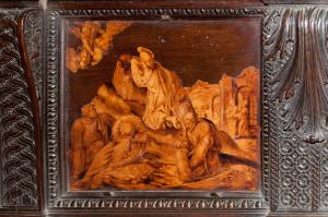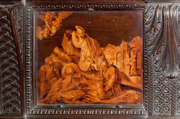 - NOTIZIE STORICO CRITICHE Nel 1522 il Consorzio della Misericordia Maggiore di Bergamo decise di dotare la basilica di Santa Maria di un nuovo coro e il 18 settembre di quell'anno deliberò di trattare con il legnaiolo e intarsiatore loverese Giovanni Francesco Capoferri per l'esecuzione dell'opera. L'artefice era noto a Bergamo fin dall'anno precedente per aver collaborato con fra' Damiano Zambelli all'esecuzione del coro intarsiato nella chiesa domenicana di Santo Stefano (ora in San Bartolomeo), inoltre nel 1522 il pittore Lorenzo Lotto gli aveva fatto tradurre in tarsia un suo disegno dell'Annunciazione (poi inserita nel bancale del celebrante, cfr. foto n. 904a) e questa dimostrazione aveva convinto il Consorzio ad affidare il lavoro al loverese. Al Capoferri, direttore dell'impresa del coro, fu affiancato il marangone Giovanni Belli di Ponteranica per i lavori di intaglio. Il principale teologo della città, fra Girolamo Terzi, fu incaricato di fornire le "inventiones" da dare ai pittori che avrebbero disegnato i cartoni da intarsiare.\nDopo aver acquisito alcuni cartoni forniti da pittori diversi, tra cui Lotto, Andrea Previtali, Francesco Rosso di Pavia, il 29 ottobre 1523 il Consorzio affidò i cartoni delle tarsie del coro al pressoché sconosciuto Nicolino Cabrini, che morì poco dopo. Il 12 marzo 1524 il Consorzio incaricò dunque Lorenzo Lotto di eseguire i disegni per le tarsie e dopo pochi mesi (2 giugno 1524) gli commissionò anche i pannelli intarsiati ("coperti") con imprese simboliche che dovevano proteggere le preziose tavolette. Lotto inizialmente effettuò anche la 'profilatura' delle tarsie, ovvero la loro rifinitura finale mediante stucco nero per i contorni delle figure e con ombreggiatura a fuoco per il chiaro-scuro, ma un contrasto di natura economica frenò la sua disponibilità. La profilatura fu allora effettuata dallo stesso Capoferri e dai pittori Andrea Previtali, Ludovico da Mantova e Lucano da Imola. Trasferitosi a Venezia nel dicembre del 1525, il pittore continuò a disegnare i cartoni delle tarsie e a inviarle a Bergamo fino al 1532, realizzando complessivamente 35 tarsie con storie bibliche di cui 4 grandi per l'iconostasi e 31 più piccole collocate oggi negli stalli del coro dei laici e nei due bancali del presbiterio; inoltre eseguì 32 tarsie a soggetto simbolico delle quali 28 costituivano i "coperti" delle tarsie istoriate e che oggi sono inserite negli schienali del coro degli ecclesiastici. \nNel 1531 si decise di ampliare la struttura del coro, trasferendo le tarsie istoriate del coro degli ecclesiastici al bancale del celebrante, a quello dei Rettori e al coro dei laici nell'abside, mentre nel coro dei religiosi rimasero i soli 'coperti' di soggetto simbolico: dei modelletti delle nuove strutture del presbiterio (bancali e coro dei laici) fu incaricato Marcantonio, figlio dell'architetto Pietro Isabello (1531-1532). Nell'ottobre del 1533, consegnati dal Capoferri gli ultimi pannelli intarsiati, risultano già collocate negli stalli del coro dei religiosi le tarsie 'simboliche' degli ex-coperti, mentre le altre tarsie istoriate rimasero per vent'anni nei depositi della Misericordia Maggiore. La fabbrica del coro fu ripresa nel 1547-1549 ma solo nel 1553-1555 i banchi della cappella maggiore furono portati a termine in base al modello elaborato dall'Isabello: nel 1553 fu chiamato a Bergamo Giovan Pietro Capoferri, fratellastro di Giovan Francesco, affermato intagliatore e intarsiatore, per la realizzazione del bancale del celebrante e della parte sinistra del coro dei laici, mentre ad Alessandro Belli, già attivo col padre nel coro degli ecclesiastici, furono assegnati il bancale dei Rettori e la parte destra del coro dei laici. Nel luglio del 1554 il bancale del celebrante era quasi del tutto intagliato, giacché fu acquistato il noce per la cimasa intagliata da Giovan Pietro Capoferri. Nelle tre spalliere furono inserite sei tarsie disegnate da Lotto e realizzate da Giovan Francesco Capoferri illustranti episodi della