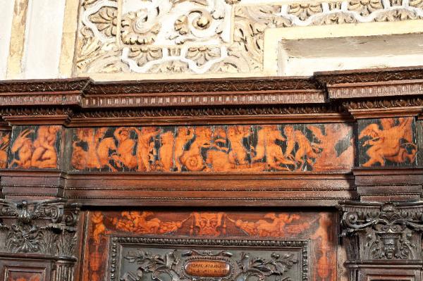 - NOTIZIE STORICO CRITICHE Nel 1522 il Consorzio della Misericordia Maggiore di Bergamo decise di dotare la basilica di Santa Maria di un nuovo coro e il 18 settembre di quell'anno deliberò di trattare con il legnaiolo e intarsiatore loverese Giovanni Francesco Capoferri per l'esecuzione dell'opera. L'artefice era noto a Bergamo fin dall'anno precedente per aver collaborato con fra' Damiano Zambelli all'esecuzione del coro intarsiato nella chiesa domenicana di Santo Stefano (ora in San Bartolomeo), inoltre nel 1522 il pittore Lorenzo Lotto gli aveva fatto tradurre in tarsia un suo disegno dell'Annunciazione (poi inserita nel bancale del celebrante, cfr. foto n. 904a) e questa dimostrazione aveva convinto il Consorzio ad affidare il lavoro al loverese. Al Capoferri, direttore dell'impresa del coro, fu affiancato il marangone Giovanni Belli di Ponteranica per i lavori di intaglio. Il principale teologo della città, fra Girolamo Terzi, fu incaricato di fornire le "inventiones" da dare ai pittori che avrebbero disegnato i cartoni da intarsiare.\nDopo aver acquisito alcuni cartoni forniti da pittori diversi, tra cui Lotto, Andrea Previtali, Francesco Rosso di Pavia, il 29 ottobre 1523 il Consorzio affidò i cartoni delle tarsie del coro al pressoché sconosciuto Nicolino Cabrini, che morì poco dopo. Il 12 marzo 1524 il Consorzio incaricò dunque Lorenzo Lotto di eseguire i disegni per le tarsie e dopo pochi mesi (2 giugno 1524) gli commissionò anche i pannelli intarsiati ("coperti") con imprese simboliche che dovevano proteggere le preziose tavolette. Lotto inizialmente effettuò anche la 'profilatura' delle tarsie, ovvero la loro rifinitura finale mediante stucco nero per i contorni delle figure e con ombreggiatura a fuoco per il chiaro-scuro, ma un contrasto di natura economica frenò la sua disponibilità. La profilatura fu allora effettuata dallo stesso Capoferri e dai pittori Andrea Previtali, Ludovico da Mantova e Lucano da Imola. Trasferitosi a Venezia nel dicembre del 1525, il pittore continuò a disegnare i cartoni delle tarsie e a inviarle a Bergamo fino al 1532, realizzando complessivamente 35 tarsie con storie bibliche di cui 4 grandi per l'iconostasi e 31 più piccole collocate oggi negli stalli del coro dei laici e nei due bancali del presbiterio; inoltre eseguì 32 tarsie a soggetto simbolico delle quali 28 costituivano i "coperti" delle tarsie istoriate e che oggi sono inserite negli schienali del coro degli ecclesiastici. \nNel 1531 si decise di ampliare la struttura del coro, trasferendo le tarsie istoriate del coro degli ecclesiastici al bancale del celebrante, a quello dei Rettori e al coro dei laici nell'abside, mentre nel coro dei religiosi rimasero i soli 'coperti' di soggetto simbolico: dei modelletti delle nuove strutture del presbiterio (bancali e coro dei laici) fu incaricato Marcantonio, figlio dell'architetto Pietro Isabello (1531-1532). Nell'ottobre del 1533, consegnati dal Capoferri gli ultimi pannelli intarsiati, risultano già collocate negli stalli del coro dei religiosi le tarsie 'simboliche' degli ex-coperti, mentre le altre tarsie istoriate rimasero per vent'anni nei depositi della Misericordia Maggiore. La fabbrica del coro fu ripresa nel 1547-1549 con l'incarico di alcuni disegni al pittore Filippo Zanchi e all'intervento dell'intarsiatore Paolo Sabatini da Pesaro e di Giovanni Donato Capoferri, detto Zinino, figlio di Giovan Francesco, che fu limitato però solo ad alcune cornici. Solo negli anni 1553-1555 i banchi della cappella maggiore furono portati a termine in base al modello elaborato dall'Isabello: nel 1553 fu chiamato a Bergamo Giovan Pietro Capoferri, fratellastro di Giovan Francesco, affermato intagliatore e intarsiatore, per la realizzazione del bancale del celebrante e della parte sinistra del coro dei laici, mentre ad Alessandro Belli, già attivo col padre nel coro degli ecclesiastici, furono assegnati il bancale dei Rettori e la parte destra del coro dei laici. Entrambi sono da considerare, oltre che artefici, anch