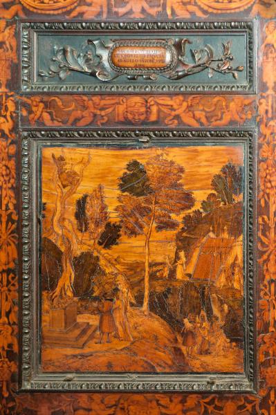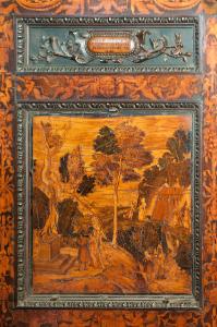 - NOTIZIE STORICO CRITICHE Nel 1522 il Consorzio della Misericordia Maggiore di Bergamo decise di dotare la basilica di Santa Maria di un nuovo coro e il 18 settembre di quell'anno deliberò di trattare con il legnaiolo e intarsiatore loverese Giovanni Francesco Capoferri per l'esecuzione dell'opera. L'artefice era noto a Bergamo fin dall'anno precedente per aver collaborato con fra' Damiano Zambelli all'esecuzione del coro intarsiato nella chiesa domenicana di Santo Stefano (ora in San Bartolomeo), inoltre nel 1522 il pittore Lorenzo Lotto gli aveva fatto tradurre in tarsia un suo disegno dell'Annunciazione (poi inserita nel bancale del celebrante, cfr. foto n. 904a) e questa dimostrazione aveva convinto il Consorzio ad affidare il lavoro al loverese. Al Capoferri, direttore dell'impresa del coro, fu affiancato il marangone Giovanni Belli di Ponteranica per i lavori di intaglio. Il principale teologo della città, fra Girolamo Terzi, fu incaricato di fornire le "inventiones" da dare ai pittori che avrebbero disegnato i cartoni da intarsiare.\nDopo aver acquisito alcuni cartoni forniti da pittori diversi, tra cui Lotto, Andrea Previtali, Francesco Rosso di Pavia, il 29 ottobre 1523 il Consorzio affidò i cartoni delle tarsie del coro al pressoché sconosciuto Nicolino Cabrini, che morì poco dopo. Il 12 marzo 1524 il Consorzio incaricò dunque Lorenzo Lotto di eseguire i disegni per le tarsie e dopo pochi mesi (2 giugno 1524) gli commissionò anche i pannelli intarsiati ("coperti") con imprese simboliche che dovevano proteggere le preziose tavolette. Lotto inizialmente effettuò anche la 'profilatura' delle tarsie, ovvero la loro rifinitura finale mediante stucco nero per i contorni delle figure e con ombreggiatura a fuoco per il chiaro-scuro, ma un contrasto di natura economica frenò la sua disponibilità. La profilatura fu allora effettuata dallo stesso Capoferri e dai pittori Andrea Previtali, Ludovico da Mantova e Lucano da Imola. Trasferitosi a Venezia nel dicembre del 1525, il pittore continuò a disegnare i cartoni delle tarsie e a inviarle a Bergamo fino al 1532, realizzando complessivamente 35 tarsie con storie bibliche di cui 4 grandi per l'iconostasi e 31 più piccole collocate oggi negli stalli del coro dei laici e nei due bancali del presbiterio; inoltre eseguì 32 tarsie a soggetto simbolico delle quali 28 costituivano i "coperti" delle tarsie istoriate e che oggi sono inserite negli schienali del coro degli ecclesiastici. \nNel 1531 si decise di ampliare la struttura del coro, trasferendo le tarsie istoriate del coro degli ecclesiastici al bancale del celebrante, a quello dei Rettori e al coro dei laici nell'abside, mentre nel coro dei religiosi rimasero i soli 'coperti' di soggetto simbolico: dei modelletti delle nuove strutture del presbiterio (bancali e coro dei laici) fu incaricato Marcantonio, figlio dell'architetto Pietro Isabello (1531-1532). Nell'ottobre del 1533, consegnati dal Capoferri gli ultimi pannelli intarsiati, risultano già collocate negli stalli del coro dei religiosi le tarsie 'simboliche' degli ex-coperti, mentre le altre tarsie istoriate rimasero per vent'anni nei depositi della Misericordia Maggiore. La fabbrica del coro fu ripresa nel 1547-1549 con l'incarico di alcuni disegni al pittore Filippo Zanchi e all'intervento dell'intarsiatore Paolo Sabatini da Pesaro e di Giovanni Donato Capoferri, detto Zinino, figlio di Giovan Francesco, che fu limitato però solo ad alcune cornici. Solo negli anni 1553-1555 i banchi della cappella maggiore furono portati a termine in base al modello elaborato dall'Isabello: nel 1553 fu chiamato a Bergamo Giovan Pietro Capoferri, fratellastro di Giovan Francesco, affermato intagliatore e intarsiatore, per la realizzazione del bancale del celebrante e della parte sinistra del coro dei laici, mentre ad Alessandro Belli, già attivo col padre nel coro degli ecclesiastici, furono assegnati il bancale dei Rettori e la parte destra del coro dei laici. Entrambi sono da considerare, oltre che artefici, anch