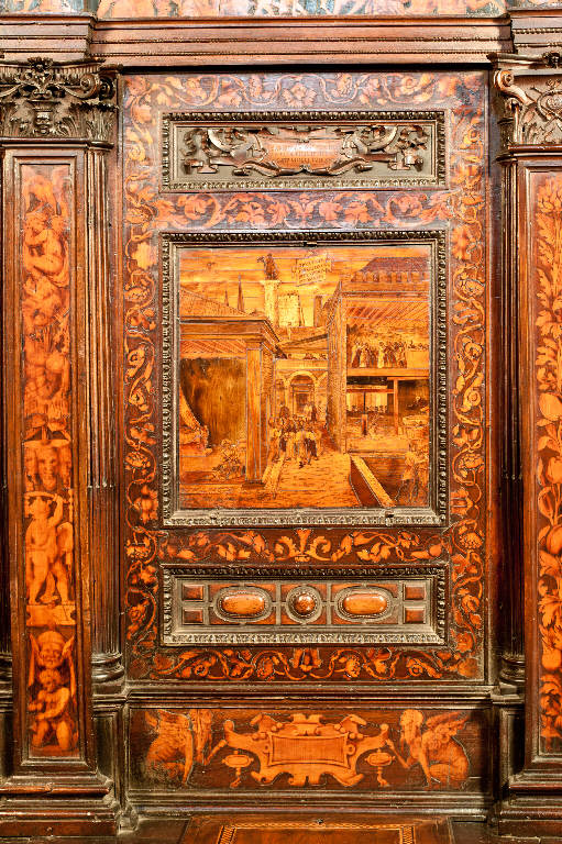 - NOTIZIE STORICO CRITICHE Nel 1522 il Consorzio della Misericordia Maggiore di Bergamo decise di dotare la basilica di Santa Maria di un nuovo coro e il 18 settembre di quell'anno deliberò di trattare con il legnaiolo e intarsiatore loverese Giovanni Francesco Capoferri per l'esecuzione dell'opera. L'artefice era noto a Bergamo fin dall'anno precedente per aver collaborato con fra' Damiano Zambelli all'esecuzione del coro intarsiato nella chiesa domenicana di Santo Stefano (ora in San Bartolomeo), inoltre nel 1522 il pittore Lorenzo Lotto gli aveva fatto tradurre in tarsia un suo disegno dell'Annunciazione (poi inserita nel bancale del celebrante, cfr. foto n. 904a) e questa dimostrazione aveva convinto il Consorzio ad affidare il lavoro al loverese. Al Capoferri, direttore dell'impresa del coro, fu affiancato il marangone Giovanni Belli di Ponteranica per i lavori di intaglio. Il principale teologo della città, fra Girolamo Terzi, fu incaricato di fornire le "inventiones" da dare ai pittori che avrebbero disegnato i cartoni da intarsiare.\nDopo aver acquisito alcuni cartoni forniti da pittori diversi, tra cui Lotto, Andrea Previtali, Francesco Rosso di Pavia, il 29 ottobre 1523 il Consorzio affidò i cartoni delle tarsie del coro al pressoché sconosciuto Nicolino Cabrini, che morì poco dopo. Il 12 marzo 1524 il Consorzio incaricò dunque Lorenzo Lotto di eseguire i disegni per le tarsie e dopo pochi mesi (2 giugno 1524) gli commissionò anche i pannelli intarsiati ("coperti") con imprese simboliche che dovevano proteggere le preziose tavolette. Lotto inizialmente effettuò anche la 'profilatura' delle tarsie, ovvero la loro rifinitura finale mediante stucco nero per i contorni delle figure e con ombreggiatura a fuoco per il chiaro-scuro, ma un contrasto di natura economica frenò la sua disponibilità. La profilatura fu allora effettuata dallo stesso Capoferri e dai pittori Andrea Previtali, Ludovico da Mantova e Lucano da Imola. Trasferitosi a Venezia nel dicembre del 1525, il pittore continuò a disegnare i cartoni delle tarsie e a inviarle a Bergamo fino al 1532, realizzando complessivamente 35 tarsie con storie bibliche di cui 4 grandi per l'iconostasi e 31 più piccole collocate oggi negli stalli del coro dei laici e nei due bancali del presbiterio; inoltre eseguì 32 tarsie a soggetto simbolico delle quali 28 costituivano i "coperti" delle tarsie istoriate e che oggi sono inserite negli schienali del coro degli ecclesiastici. \nNel 1531 si decise di ampliare la struttura del coro, trasferendo le tarsie istoriate del coro degli ecclesiastici al bancale del celebrante, a quello dei Rettori e al coro dei laici nell'abside, mentre nel coro dei religiosi rimasero i soli 'coperti' di soggetto simbolico: dei modelletti delle nuove strutture del presbiterio (bancali e coro dei laici) fu incaricato Marcantonio, figlio dell'architetto Pietro Isabello (1531-1532). Nell'ottobre del 1533, consegnati dal Capoferri gli ultimi pannelli intarsiati, risultano già collocate negli stalli del coro dei religiosi le tarsie 'simboliche' degli ex-coperti, mentre le altre tarsie istoriate rimasero per vent'anni nei depositi della Misericordia Maggiore. La fabbrica del coro fu ripresa nel 1547-1549 con l'incarico di alcuni disegni al pittore Filippo Zanchi e all'intervento dell'intarsiatore Paolo Sabatini da Pesaro e di Giovanni Donato Capoferri, detto Zinino, figlio di Giovan Francesco, che fu limitato però solo ad alcune cornici. Solo negli anni 1553-1555 i banchi della cappella maggiore furono portati a termine in base al modello elaborato dall'Isabello: nel 1553 fu chiamato a Bergamo Giovan Pietro Capoferri, fratellastro di Giovan Francesco, affermato intagliatore e intarsiatore, per la realizzazione del bancale del celebrante e della parte sinistra del coro dei laici, mentre ad Alessandro Belli, già attivo col padre nel coro degli ecclesiastici, furono assegnati il bancale dei Rettori e la parte destra del coro dei laici. Entrambi sono da considerare, oltre che artefici, anch