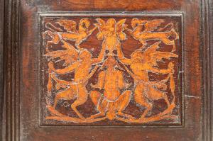 - NOTIZIE STORICO CRITICHE Nel 1522 il Consorzio della Misericordia Maggiore di Bergamo decise di dotare la basilica di Santa Maria di un nuovo coro e il 18 settembre di quell'anno deliberò di trattare con il legnaiolo e intarsiatore loverese Giovanni Francesco Capoferri per l'esecuzione dell'opera. L'artefice era noto a Bergamo fin dall'anno precedente per aver collaborato con fra' Damiano Zambelli all'esecuzione del coro intarsiato nella chiesa domenicana di Santo Stefano (ora in San Bartolomeo), inoltre nel 1522 il pittore Lorenzo Lotto gli aveva fatto tradurre in tarsia un suo disegno dell'Annunciazione (poi inserita nel bancale del celebrante, cfr. foto n. 904a) e questa dimostrazione aveva convinto il Consorzio ad affidare il lavoro al loverese. Al Capoferri, direttore dell'impresa del coro, fu affiancato il marangone Giovanni Belli di Ponteranica per i lavori di intaglio. Il principale teologo della città, fra Girolamo Terzi, fu incaricato di fornire le "inventiones" da dare ai pittori che avrebbero disegnato i cartoni da intarsiare.\nDopo aver acquisito alcuni cartoni forniti da pittori diversi, tra cui Lotto, Andrea Previtali, Francesco Rosso di Pavia, il 29 ottobre 1523 il Consorzio affidò i cartoni delle tarsie del coro al pressoché sconosciuto Nicolino Cabrini, che morì poco dopo. Il 12 marzo 1524 il Consorzio incaricò dunque Lorenzo Lotto di eseguire i disegni per le tarsie e dopo pochi mesi (2 giugno 1524) gli commissionò anche i pannelli intarsiati ("coperti") con imprese simboliche che dovevano proteggere le preziose tavolette. Lotto inizialmente effettuò anche la 'profilatura' delle tarsie, ovvero la loro rifinitura finale mediante stucco nero per i contorni delle figure e con ombreggiatura a fuoco per il chiaro-scuro, ma un contrasto di natura economica frenò la sua disponibilità. La profilatura fu allora effettuata dallo stesso Capoferri e dai pittori Andrea Previtali, Ludovico da Mantova e Lucano da Imola. Trasferitosi a Venezia nel dicembre del 1525, il pittore continuò a disegnare i cartoni delle tarsie e a inviarle a Bergamo fino al 1532, realizzando complessivamente 35 tarsie con storie bibliche di cui 4 grandi per l'iconostasi e 31 più piccole collocate oggi negli stalli del coro dei laici e nei due bancali del presbiterio; inoltre eseguì 32 tarsie a soggetto simbolico delle quali 28 costituivano i "coperti" delle tarsie istoriate e che oggi sono inserite negli schienali del coro degli ecclesiastici. \nNel 1531 si decise di ampliare la struttura del coro, trasferendo le tarsie istoriate del coro degli ecclesiastici al bancale del celebrante, a quello dei Rettori e al coro dei laici nell'abside, mentre nel coro dei religiosi rimasero i soli 'coperti' di soggetto simbolico: dei modelletti delle nuove strutture del presbiterio (bancali e coro dei laici) fu incaricato Marcantonio, figlio dell'architetto Pietro Isabello (1531-1532). Nell'ottobre del 1533, consegnati dal Capoferri gli ultimi pannelli intarsiati, risultano già collocate negli stalli del coro dei religiosi le tarsie 'simboliche' degli ex-coperti, mentre le altre tarsie istoriate rimasero per vent'anni nei depositi della Misericordia Maggiore. La fabbrica del coro fu ripresa nel 1547-1549 con l'incarico di alcuni disegni al pittore Filippo Zanchi e all'intervento dell'intarsiatore Paolo Sabatini da Pesaro e di Giovanni Donato Capoferri, detto Zinino, figlio di Giovan Francesco, che fu limitato però solo ad alcune cornici. Solo negli anni 1553-1555 i banchi della cappella maggiore furono portati a termine in base al modello elaborato dall'Isabello: nel 1553 fu chiamato a Bergamo Giovan Pietro Capoferri, fratellastro di Giovan Francesco, affermato intagliatore e intarsiatore, per la realizzazione del bancale del celebrante e della parte sinistra del coro dei laici, mentre ad Alessandro Belli, già attivo col padre nel coro degli ecclesiastici, furono assegnati il bancale dei Rettori e la parte destra del coro dei laici. Entrambi sono da considerare, oltre che artefici, anch