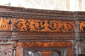 - NOTIZIE STORICO CRITICHE Nel 1522 il Consorzio della Misericordia Maggiore di Bergamo decise di dotare la basilica di Santa Maria di un nuovo coro e il 18 settembre di quell'anno deliberò di trattare con il legnaiolo e intarsiatore loverese Giovanni Francesco Capoferri per l'esecuzione dell'opera. L'artefice era noto a Bergamo fin dall'anno precedente per aver collaborato con fra' Damiano Zambelli all'esecuzione del coro intarsiato nella chiesa domenicana di Santo Stefano (ora in San Bartolomeo), inoltre nel 1522 il pittore Lorenzo Lotto gli aveva fatto tradurre in tarsia un suo disegno dell'Annunciazione (poi inserita nel bancale del celebrante, cfr. foto n. 904a) e questa dimostrazione aveva convinto il Consorzio ad affidare il lavoro al loverese. Al Capoferri, direttore dell'impresa del coro, fu affiancato il marangone Giovanni Belli di Ponteranica per i lavori di intaglio. Il principale teologo della città, fra Girolamo Terzi, fu incaricato di fornire le "inventiones" da dare ai pittori che avrebbero disegnato i cartoni da intarsiare.\nDopo aver acquisito alcuni cartoni forniti da pittori diversi, tra cui Lotto, Andrea Previtali, Francesco Rosso di Pavia, il 29 ottobre 1523 il Consorzio affidò i cartoni delle tarsie del coro al pressoché sconosciuto Nicolino Cabrini, che morì poco dopo. Il 12 marzo 1524 il Consorzio incaricò dunque Lorenzo Lotto di eseguire i disegni per le tarsie e dopo pochi mesi (2 giugno 1524) gli commissionò anche i pannelli intarsiati ("coperti") con imprese simboliche che dovevano proteggere le preziose tavolette. Lotto inizialmente effettuò anche la 'profilatura' delle tarsie, ovvero la loro rifinitura finale mediante stucco nero per i contorni delle figure e con ombreggiatura a fuoco per il chiaro-scuro, ma un contrasto di natura economica frenò la sua disponibilità. La profilatura fu allora effettuata dallo stesso Capoferri e dai pittori Andrea Previtali, Ludovico da Mantova e Lucano da Imola. Trasferitosi a Venezia nel dicembre del 1525, il pittore continuò a disegnare i cartoni delle tarsie e a inviarle a Bergamo fino al 1532, realizzando complessivamente 35 tarsie con storie bibliche di cui 4 grandi per l'iconostasi e 31 più piccole collocate oggi negli stalli del coro dei laici e nei due bancali del presbiterio; inoltre eseguì 32 tarsie a soggetto simbolico delle quali 28 costituivano i "coperti" delle tarsie istoriate e che oggi sono inserite negli schienali del coro degli ecclesiastici. \nNel 1531 si decise di ampliare la struttura del coro, trasferendo le tarsie istoriate del coro degli ecclesiastici al bancale del celebrante, a quello dei Rettori e al coro dei laici nell'abside, mentre nel coro dei religiosi rimasero i soli 'coperti' di soggetto simbolico: dei modelletti delle nuove strutture del presbiterio (bancali e coro dei laici) fu incaricato Marcantonio, figlio dell'architetto Pietro Isabello (1531-1532). Nell'ottobre del 1533, consegnati dal Capoferri gli ultimi pannelli intarsiati, risultano già collocate negli stalli del coro dei religiosi le tarsie 'simboliche' degli ex-coperti, mentre le altre tarsie istoriate rimasero per vent'anni nei depositi della Misericordia Maggiore. La fabbrica del coro fu ripresa nel 1547-1549 con l'incarico di alcuni disegni al pittore Filippo Zanchi e all'intervento dell'intarsiatore Paolo Sabatini da Pesaro e di Giovanni Donato Capoferri, detto Zinino, figlio di Giovan Francesco, che fu limitato però solo ad alcune cornici. Solo negli anni 1553-1555 i banchi della cappella maggiore furono portati a termine in base al modello elaborato dall'Isabello: nel 1553 fu chiamato a Bergamo Giovan Pietro Capoferri, fratellastro di Giovan Francesco, affermato intagliatore e intarsiatore, per la realizzazione del bancale del celebrante e della parte sinistra del coro dei laici, mentre ad Alessandro Belli, già attivo col padre nel coro degli ecclesiastici, furono assegnati il bancale dei Rettori e la parte destra del coro dei laici. Entrambi sono da considerare, oltre che artefici, anch