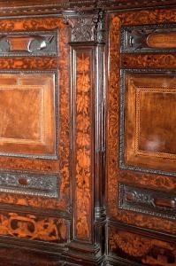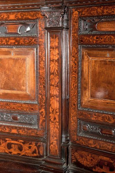 Lesena con capitello in legno intagliato con foglie di acanto, teste di delfino e, al centro, faretra, spada e testa di angioletto; fusto decorato con pannello intarsiato raffigurante una coppia di putti che pigiano l'uva e un festone di frutti.