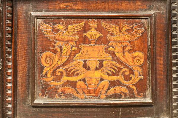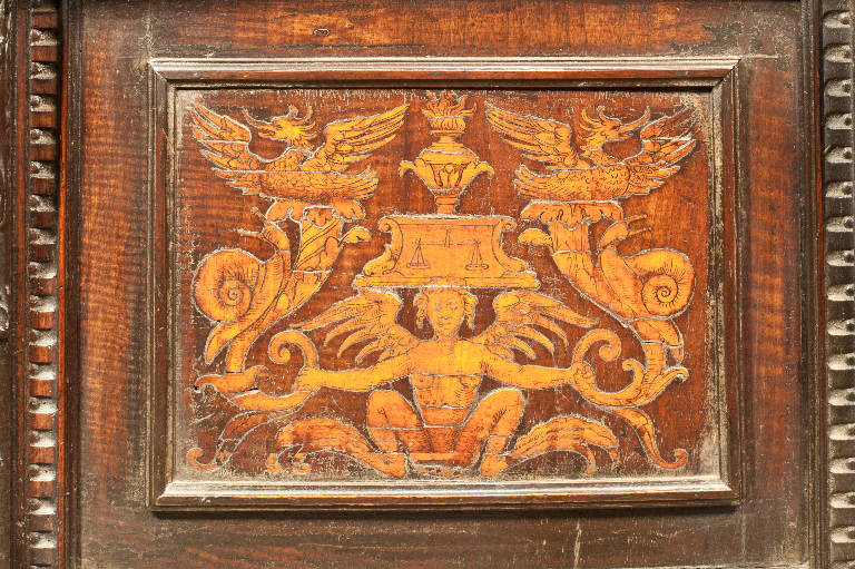 - NOTIZIE STORICO CRITICHE Nel 1522 il Consorzio della Misericordia Maggiore di Bergamo decise di dotare la basilica di Santa Maria di un nuovo coro e il 18 settembre di quell'anno deliberò di trattare con il legnaiolo e intarsiatore loverese Giovanni Francesco Capoferri per l'esecuzione dell'opera. L'artefice era noto a Bergamo fin dall'anno precedente per aver collaborato con fra' Damiano Zambelli all'esecuzione del coro intarsiato nella chiesa domenicana di Santo Stefano (ora in San Bartolomeo), inoltre nel 1522 il pittore Lorenzo Lotto gli aveva fatto tradurre in tarsia un suo disegno dell'Annunciazione (poi inserita nel bancale del celebrante, cfr. foto n. 904a) e questa dimostrazione aveva convinto il Consorzio ad affidare il lavoro al loverese. Al Capoferri, direttore dell'impresa del coro, fu affiancato il marangone Giovanni Belli di Ponteranica per i lavori di intaglio. Il principale teologo della città, fra Girolamo Terzi, fu incaricato di fornire le "inventiones" da dare ai pittori che avrebbero disegnato i cartoni da intarsiare.\nDopo aver acquisito alcuni cartoni forniti da pittori diversi, tra cui Lotto, Andrea Previtali, Francesco Rosso di Pavia, il 29 ottobre 1523 il Consorzio affidò i cartoni delle tarsie del coro al pressoché sconosciuto Nicolino Cabrini, che morì poco dopo. Il 12 marzo 1524 il Consorzio incaricò dunque Lorenzo Lotto di eseguire i disegni per le tarsie e dopo pochi mesi (2 giugno 1524) gli commissionò anche i pannelli intarsiati ("coperti") con imprese simboliche che dovevano proteggere le preziose tavolette. Lotto inizialmente effettuò anche la 'profilatura' delle tarsie, ovvero la loro rifinitura finale mediante stucco nero per i contorni delle figure e con ombreggiatura a fuoco per il chiaro-scuro, ma un contrasto di natura economica frenò la sua disponibilità. La profilatura fu allora effettuata dallo stesso Capoferri e dai pittori Andrea Previtali, Ludovico da Mantova e Lucano da Imola. Trasferitosi a Venezia nel dicembre del 1525, il pittore continuò a disegnare i cartoni delle tarsie e a inviarle a Bergamo fino al 1532, realizzando complessivamente 35 tarsie con storie bibliche di cui 4 grandi per l'iconostasi e 31 più piccole collocate oggi negli stalli del coro dei laici e nei due bancali del presbiterio; inoltre eseguì 32 tarsie a soggetto simbolico delle quali 28 costituivano i "coperti" delle tarsie istoriate e che oggi sono inserite negli schienali del coro degli ecclesiastici. \nNel 1531 si decise di ampliare la struttura del coro, trasferendo le tarsie istoriate del coro degli ecclesiastici al bancale del celebrante, a quello dei Rettori e al coro dei laici nell'abside, mentre nel coro dei religiosi rimasero i soli 'coperti' di soggetto simbolico: dei modelletti delle nuove strutture del presbiterio (bancali e coro dei laici) fu incaricato Marcantonio, figlio dell'architetto Pietro Isabello (1531-1532). Nell'ottobre del 1533, consegnati dal Capoferri gli ultimi pannelli intarsiati, risultano già collocate negli stalli del coro dei religiosi le tarsie 'simboliche' degli ex-coperti, mentre le altre tarsie istoriate rimasero per vent'anni nei depositi della Misericordia Maggiore. La fabbrica del coro fu ripresa nel 1547-1549 con l'incarico di alcuni disegni al pittore Filippo Zanchi e all'intervento dell'intarsiatore Paolo Sabatini da Pesaro e di Giovanni Donato Capoferri, detto Zinino, figlio di Giovan Francesco, che fu limitato però solo ad alcune cornici. Solo negli anni 1553-1555 i banchi della cappella maggiore furono portati a termine in base al modello elaborato dall'Isabello: nel 1553 fu chiamato a Bergamo Giovan Pietro Capoferri, fratellastro di Giovan Francesco, affermato intagliatore e intarsiatore, per la realizzazione del bancale del celebrante e della parte sinistra del coro dei laici, mentre ad Alessandro Belli, già attivo col padre nel coro degli ecclesiastici, furono assegnati il bancale dei Rettori e la parte destra del coro dei laici. Entrambi sono da considerare, oltre che artefici, anch