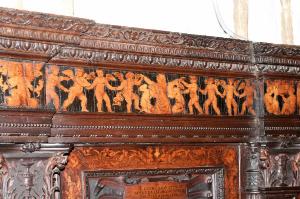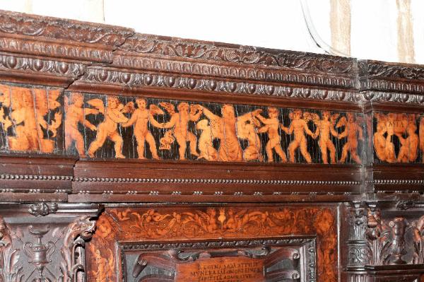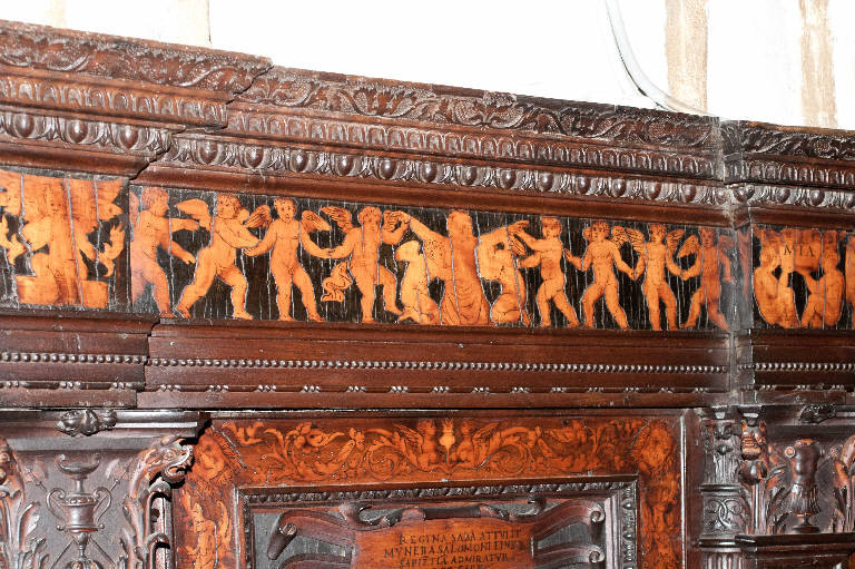 - NOTIZIE STORICO CRITICHE Nel 1522 il Consorzio della Misericordia Maggiore di Bergamo decise di dotare la basilica di Santa Maria di un nuovo coro e il 18 settembre di quell'anno deliberò di trattare con il legnaiolo e intarsiatore loverese Giovanni Francesco Capoferri per l'esecuzione dell'opera. L'artefice era noto a Bergamo fin dall'anno precedente per aver collaborato con fra' Damiano Zambelli all'esecuzione del coro intarsiato nella chiesa domenicana di Santo Stefano (ora in San Bartolomeo), inoltre nel 1522 il pittore Lorenzo Lotto gli aveva fatto tradurre in tarsia un suo disegno dell'Annunciazione (poi inserita nel bancale del celebrante, cfr. foto n. 904a) e questa dimostrazione aveva convinto il Consorzio ad affidare il lavoro al loverese. Al Capoferri, direttore dell'impresa del coro, fu affiancato il marangone Giovanni Belli di Ponteranica per i lavori di intaglio. Il principale teologo della città, fra Girolamo Terzi, fu incaricato di fornire le "inventiones" da dare ai pittori che avrebbero disegnato i cartoni da intarsiare.\nDopo aver acquisito alcuni cartoni forniti da pittori diversi, tra cui Lotto, Andrea Previtali, Francesco Rosso di Pavia, il 29 ottobre 1523 il Consorzio affidò i cartoni delle tarsie del coro al pressoché sconosciuto Nicolino Cabrini, che morì poco dopo. Il 12 marzo 1524 il Consorzio incaricò dunque Lorenzo Lotto di eseguire i disegni per le tarsie e dopo pochi mesi (2 giugno 1524) gli commissionò anche i pannelli intarsiati ("coperti") con imprese simboliche che dovevano proteggere le preziose tavolette. Lotto inizialmente effettuò anche la 'profilatura' delle tarsie, ovvero la loro rifinitura finale mediante stucco nero per i contorni delle figure e con ombreggiatura a fuoco per il chiaro-scuro, ma un contrasto di natura economica frenò la sua disponibilità. La profilatura fu allora effettuata dallo stesso Capoferri e dai pittori Andrea Previtali, Ludovico da Mantova e Lucano da Imola. Trasferitosi a Venezia nel dicembre del 1525, il pittore continuò a disegnare i cartoni delle tarsie e a inviarle a Bergamo fino al 1532, realizzando complessivamente 35 tarsie con storie bibliche di cui 4 grandi per l'iconostasi e 31 più piccole collocate oggi negli stalli del coro dei laici e nei due bancali del presbiterio; inoltre eseguì 32 tarsie a soggetto simbolico delle quali 28 costituivano i "coperti" delle tarsie istoriate e che oggi sono inserite negli schienali del coro degli ecclesiastici. \nNel 1531 si decise di ampliare la struttura del coro, trasferendo le tarsie istoriate del coro degli ecclesiastici al bancale del celebrante, a quello dei Rettori e al coro dei laici nell'abside, mentre nel coro dei religiosi rimasero i soli 'coperti' di soggetto simbolico: dei modelletti delle nuove strutture del presbiterio (bancali e coro dei laici) fu incaricato Marcantonio, figlio dell'architetto Pietro Isabello (1531-1532). Nell'ottobre del 1533, consegnati dal Capoferri gli ultimi pannelli intarsiati, risultano già collocate negli stalli del coro dei religiosi le tarsie 'simboliche' degli ex-coperti, mentre le altre tarsie istoriate rimasero per vent'anni nei depositi della Misericordia Maggiore. La fabbrica del coro fu ripresa nel 1547-1549 con l'incarico di alcuni disegni al pittore Filippo Zanchi e all'intervento dell'intarsiatore Paolo Sabatini da Pesaro e di Giovanni Donato Capoferri, detto Zinino, figlio di Giovan Francesco, che fu limitato però solo ad alcune cornici. Solo negli anni 1553-1555 i banchi della cappella maggiore furono portati a termine in base al modello elaborato dall'Isabello: nel 1553 fu chiamato a Bergamo Giovan Pietro Capoferri, fratellastro di Giovan Francesco, affermato intagliatore e intarsiatore, per la realizzazione del bancale del celebrante e della parte sinistra del coro dei laici, mentre ad Alessandro Belli, già attivo col padre nel coro degli ecclesiastici, furono assegnati il bancale dei Rettori e la parte destra del coro dei laici. Entrambi sono da considerare, oltre che artefici, anch