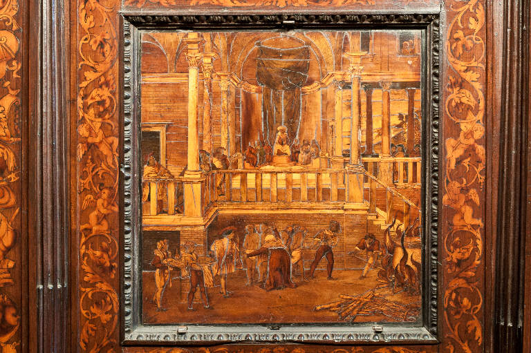 - NOTIZIE STORICO CRITICHE Nel 1522 il Consorzio della Misericordia Maggiore di Bergamo decise di dotare la basilica di Santa Maria di un nuovo coro e il 18 settembre di quell'anno deliberò di trattare con il legnaiolo e intarsiatore loverese Giovanni Francesco Capoferri per l'esecuzione dell'opera. L'artefice era noto a Bergamo fin dall'anno precedente per aver collaborato con fra' Damiano Zambelli all'esecuzione del coro intarsiato nella chiesa domenicana di Santo Stefano (ora in San Bartolomeo), inoltre nel 1522 il pittore Lorenzo Lotto gli aveva fatto tradurre in tarsia un suo disegno dell'Annunciazione (poi inserita nel bancale del celebrante, cfr. foto n. 904a) e questa dimostrazione aveva convinto il Consorzio ad affidare il lavoro al loverese. Al Capoferri, direttore dell'impresa del coro, fu affiancato il marangone Giovanni Belli di Ponteranica per i lavori di intaglio. Il principale teologo della città, fra Girolamo Terzi, fu incaricato di fornire le "inventiones" da dare ai pittori che avrebbero disegnato i cartoni da intarsiare.\nDopo aver acquisito alcuni cartoni forniti da pittori diversi, tra cui Lotto, Andrea Previtali, Francesco Rosso di Pavia, il 29 ottobre 1523 il Consorzio affidò i cartoni delle tarsie del coro al pressoché sconosciuto Nicolino Cabrini, che morì poco dopo. Il 12 marzo 1524 il Consorzio incaricò dunque Lorenzo Lotto di eseguire i disegni per le tarsie e dopo pochi mesi (2 giugno 1524) gli commissionò anche i pannelli intarsiati ("coperti") con imprese simboliche che dovevano proteggere le preziose tavolette. Lotto inizialmente effettuò anche la 'profilatura' delle tarsie, ovvero la loro rifinitura finale mediante stucco nero per i contorni delle figure e con ombreggiatura a fuoco per il chiaro-scuro, ma un contrasto di natura economica frenò la sua disponibilità. La profilatura fu allora effettuata dallo stesso Capoferri e dai pittori Andrea Previtali, Ludovico da Mantova e Lucano da Imola. Trasferitosi a Venezia nel dicembre del 1525, il pittore continuò a disegnare i cartoni delle tarsie e a inviarle a Bergamo fino al 1532, realizzando complessivamente 35 tarsie con storie bibliche di cui 4 grandi per l'iconostasi e 31 più piccole collocate oggi negli stalli del coro dei laici e nei due bancali del presbiterio; inoltre eseguì 32 tarsie a soggetto simbolico delle quali 28 costituivano i "coperti" delle tarsie istoriate e che oggi sono inserite negli schienali del coro degli ecclesiastici. \nNel 1531 si decise di ampliare la struttura del coro, trasferendo le tarsie istoriate del coro degli ecclesiastici al bancale del celebrante, a quello dei Rettori e al coro dei laici nell'abside, mentre nel coro dei religiosi rimasero i soli 'coperti' di soggetto simbolico: dei modelletti delle nuove strutture del presbiterio (bancali e coro dei laici) fu incaricato Marcantonio, figlio dell'architetto Pietro Isabello (1531-1532). Nell'ottobre del 1533, consegnati dal Capoferri gli ultimi pannelli intarsiati, risultano già collocate negli stalli del coro dei religiosi le tarsie 'simboliche' degli ex-coperti, mentre le altre tarsie istoriate rimasero per vent'anni nei depositi della Misericordia Maggiore. La fabbrica del coro fu ripresa nel 1547-1549 con l'incarico di alcuni disegni al pittore Filippo Zanchi e all'intervento dell'intarsiatore Paolo Sabatini da Pesaro e di Giovanni Donato Capoferri, detto Zinino, figlio di Giovan Francesco, che fu limitato però solo ad alcune cornici. Solo negli anni 1553-1555 i banchi della cappella maggiore furono portati a termine in base al modello elaborato dall'Isabello: nel 1553 fu chiamato a Bergamo Giovan Pietro Capoferri, fratellastro di Giovan Francesco, affermato intagliatore e intarsiatore, per la realizzazione del bancale del celebrante e della parte sinistra del coro dei laici, mentre ad Alessandro Belli, già attivo col padre nel coro degli ecclesiastici, furono assegnati il bancale dei Rettori e la parte destra del coro dei laici. Entrambi sono da considerare, oltre che artefici, anch