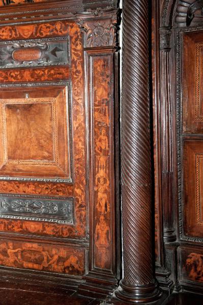 Lesena con capitello in legno intagliato con foglie di acanto, teste di delfino e, al centro, una corazza con lance incrociate; fusto decorato con pannello intarsiato raffigurante un soldato sorreggente un'anfora, strumenti musicali, armi e maschere.