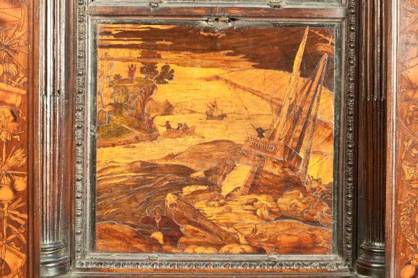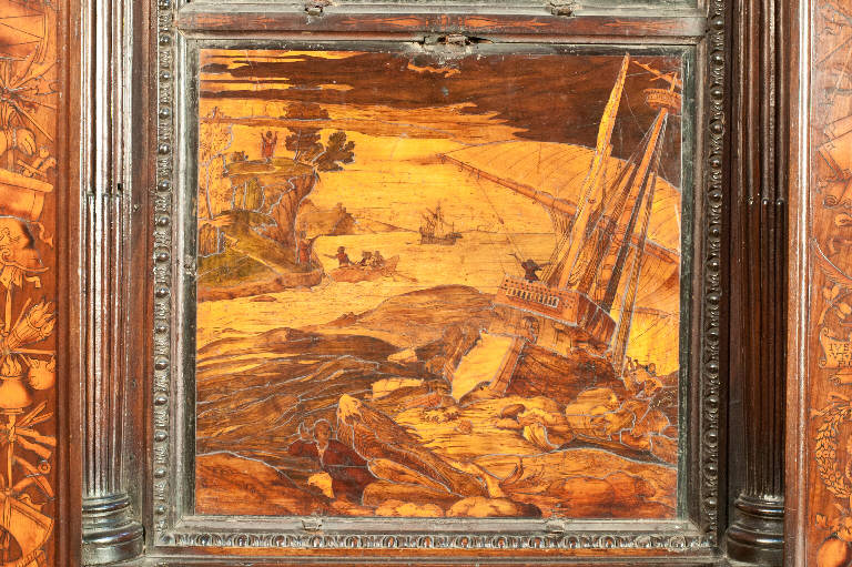 - NOTIZIE STORICO CRITICHE Nel 1522 il Consorzio della Misericordia Maggiore di Bergamo decise di dotare la basilica di Santa Maria di un nuovo coro e il 18 settembre di quell'anno deliberò di trattare con il legnaiolo e intarsiatore loverese Giovanni Francesco Capoferri per l'esecuzione dell'opera. Al Capoferri, direttore dell'impresa del coro, fu affiancato il marangone Giovanni Belli di Ponteranica per i lavori di intaglio. Il principale teologo della città, fra Girolamo Terzi, fu incaricato di fornire le "inventiones" da dare ai pittori che avrebbero disegnato i cartoni da intarsiare.\nDopo aver acquisito alcuni cartoni forniti da pittori diversi, tra cui Lotto, Andrea Previtali, Francesco Rosso di Pavia, il 29 ottobre 1523 il Consorzio affidò i cartoni delle tarsie del coro al pressoché sconosciuto Nicolino Cabrini, che morì poco dopo. Il 12 marzo 1524 il Consorzio incaricò dunque Lorenzo Lotto di eseguire i disegni per le tarsie e dopo pochi mesi (2 giugno 1524) gli commissionò anche i pannelli intarsiati ("coperti") con imprese simboliche che dovevano proteggere le preziose tavolette. Lotto inizialmente effettuò anche la 'profilatura' delle tarsie, ovvero la loro rifinitura finale mediante stucco nero per i contorni delle figure e con ombreggiatura a fuoco per il chiaro-scuro, ma un contrasto di natura economica frenò la sua disponibilità. La profilatura fu allora effettuata dallo stesso Capoferri e dai pittori Andrea Previtali, Ludovico da Mantova e Lucano da Imola. Trasferitosi a Venezia nel dicembre del 1525, il pittore continuò a disegnare i cartoni delle tarsie e a inviarle a Bergamo fino al 1532, realizzando complessivamente 35 tarsie con storie bibliche di cui 4 grandi per l'iconostasi e 31 più piccole collocate oggi negli stalli del coro dei laici e nei due bancali del presbiterio; inoltre eseguì 32 tarsie a soggetto simbolico delle quali 28 costituivano i "coperti" delle tarsie istoriate e che oggi sono inserite negli schienali del coro degli ecclesiastici. \nNel 1531 si decise di ampliare la struttura del coro, trasferendo le tarsie istoriate del coro degli ecclesiastici al bancale del celebrante, a quello dei Rettori e al coro dei laici nell'abside, mentre nel coro dei religiosi rimasero i soli 'coperti' di soggetto simbolico: dei modelletti delle nuove strutture del presbiterio (bancali e coro dei laici) fu incaricato Marcantonio, figlio dell'architetto Pietro Isabello (1531-1532). Nell'ottobre del 1533, consegnati dal Capoferri gli ultimi pannelli intarsiati, risultano già collocate negli stalli del coro dei religiosi le tarsie 'simboliche' degli ex-coperti, mentre le altre tarsie istoriate rimasero per vent'anni nei depositi della Misericordia Maggiore. La fabbrica del coro fu ripresa nel 1547-1549 ma solo nel 1553-1555 i banchi della cappella maggiore furono portati a termine in base al modello elaborato dall'Isabello: nel 1553 fu chiamato a Bergamo Giovan Pietro Capoferri, fratellastro di Giovan Francesco, per la realizzazione del bancale del celebrante e della parte sinistra del coro dei laici, mentre ad Alessandro Belli, già attivo col padre nel coro degli ecclesiastici, furono assegnati il bancale dei Rettori, dove fu inserita la presente tarsia, e la parte destra del coro dei laici. Nell'agosto del 1554 il bancale dei Rettori era quasi completato, giacché risulta che fu verniciato dal doratore Giacomo da Olera. Nelle tre spalliere furono inserite sei tarsie disegnate da Lotto e realizzate da Giovan Francesco Capoferri illustranti episodi dell'Antico Testamento, mentre nel basamento furono collocate tarsie con le Virtù e con Episodi della vita di Cristo, disegnate da Lucano da Imola e da Giuseppe Belli ed eseguite da Alessandro Belli. A causa di un fulmine alcune di queste ultime tarsie rimasero danneggiate e nel 1572-1574 furono sostituite con la prima versione del "Sacrificio di Adamo e Abele", rimasta inutilizzata fino ad allora. Il bancale fu dotato di 'coperti' per le tarsie principali forse tra la fine del '700 e l'inizio