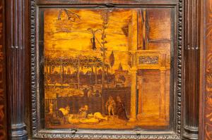 - NOTIZIE STORICO CRITICHE Nel 1522 il Consorzio della Misericordia Maggiore di Bergamo decise di dotare la basilica di Santa Maria di un nuovo coro e il 18 settembre di quell'anno deliberò di trattare con il legnaiolo e intarsiatore loverese Giovanni Francesco Capoferri per l'esecuzione dell'opera. Al Capoferri, direttore dell'impresa del coro, fu affiancato il marangone Giovanni Belli di Ponteranica per i lavori di intaglio. Il principale teologo della città, fra Girolamo Terzi, fu incaricato di fornire le "inventiones" da dare ai pittori che avrebbero disegnato i cartoni da intarsiare.\nDopo aver acquisito alcuni cartoni forniti da pittori diversi, tra cui Lotto, Andrea Previtali, Francesco Rosso di Pavia, il 29 ottobre 1523 il Consorzio affidò i cartoni delle tarsie del coro al pressoché sconosciuto Nicolino Cabrini, che morì poco dopo. Il 12 marzo 1524 il Consorzio incaricò dunque Lorenzo Lotto di eseguire i disegni per le tarsie e dopo pochi mesi (2 giugno 1524) gli commissionò anche i pannelli intarsiati ("coperti") con imprese simboliche che dovevano proteggere le preziose tavolette. Lotto inizialmente effettuò anche la 'profilatura' delle tarsie, ovvero la loro rifinitura finale mediante stucco nero per i contorni delle figure e con ombreggiatura a fuoco per il chiaro-scuro, ma un contrasto di natura economica frenò la sua disponibilità. La profilatura fu allora effettuata dallo stesso Capoferri e dai pittori Andrea Previtali, Ludovico da Mantova e Lucano da Imola. Trasferitosi a Venezia nel dicembre del 1525, il pittore continuò a disegnare i cartoni delle tarsie e a inviarle a Bergamo fino al 1532, realizzando complessivamente 35 tarsie con storie bibliche di cui 4 grandi per l'iconostasi e 31 più piccole collocate oggi negli stalli del coro dei laici e nei due bancali del presbiterio; inoltre eseguì 32 tarsie a soggetto simbolico delle quali 28 costituivano i "coperti" delle tarsie istoriate e che oggi sono inserite negli schienali del coro degli ecclesiastici. \nNel 1531 si decise di ampliare la struttura del coro, trasferendo le tarsie istoriate del coro degli ecclesiastici al bancale del celebrante, a quello dei Rettori e al coro dei laici nell'abside, mentre nel coro dei religiosi rimasero i soli 'coperti' di soggetto simbolico: dei modelletti delle nuove strutture del presbiterio (bancali e coro dei laici) fu incaricato Marcantonio, figlio dell'architetto Pietro Isabello (1531-1532). Nell'ottobre del 1533, consegnati dal Capoferri gli ultimi pannelli intarsiati, risultano già collocate negli stalli del coro dei religiosi le tarsie 'simboliche' degli ex-coperti, mentre le altre tarsie istoriate rimasero per vent'anni nei depositi della Misericordia Maggiore. La fabbrica del coro fu ripresa nel 1547-1549 ma solo nel 1553-1555 i banchi della cappella maggiore furono portati a termine in base al modello elaborato dall'Isabello: nel 1553 fu chiamato a Bergamo Giovan Pietro Capoferri, fratellastro di Giovan Francesco, per la realizzazione del bancale del celebrante e della parte sinistra del coro dei laici, mentre ad Alessandro Belli, già attivo col padre nel coro degli ecclesiastici, furono assegnati il bancale dei Rettori, dove fu inserita la presente tarsia, e la parte destra del coro dei laici. Nell'agosto del 1554 il bancale dei Rettori era quasi completato, giacché risulta che fu verniciato dal doratore Giacomo da Olera. Nelle tre spalliere furono inserite sei tarsie disegnate da Lotto e realizzate da Giovan Francesco Capoferri illustranti episodi dell'Antico Testamento, mentre nel basamento furono collocate tarsie con le Virtù e con Episodi della vita di Cristo, disegnate da Lucano da Imola e da Giuseppe Belli ed eseguite da Alessandro Belli. A causa di un fulmine alcune di queste ultime tarsie rimasero danneggiate e nel 1572-1574 furono sostituite con la prima versione del "Sacrificio di Adamo e Abele", rimasta inutilizzata fino ad allora. Il bancale fu dotato di 'coperti' per le tarsie principali forse tra la fine del '700 e l'inizio