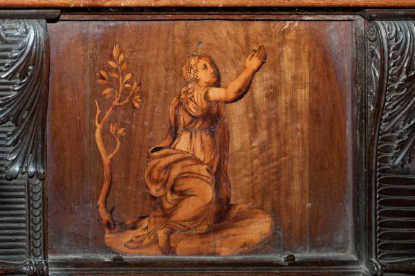 - NOTIZIE STORICO CRITICHE Nel 1522 il Consorzio della Misericordia Maggiore di Bergamo decise di dotare la basilica di Santa Maria di un nuovo coro e il 18 settembre di quell'anno deliberò di trattare con il legnaiolo e intarsiatore loverese Giovanni Francesco Capoferri per l'esecuzione dell'opera. L'artefice era noto a Bergamo fin dall'anno precedente per aver collaborato con fra' Damiano Zambelli all'esecuzione del coro intarsiato nella chiesa domenicana di Santo Stefano (ora in San Bartolomeo), inoltre nel 1522 il pittore Lorenzo Lotto gli aveva fatto tradurre in tarsia un suo disegno dell'Annunciazione (poi inserita nel bancale del celebrante, cfr. foto n. 904a) e questa dimostrazione aveva convinto il Consorzio ad affidare il lavoro al loverese. Al Capoferri, direttore dell'impresa del coro, fu affiancato il marangone Giovanni Belli di Ponteranica per i lavori di intaglio. Il principale teologo della città, fra Girolamo Terzi, fu incaricato di fornire le "inventiones" da dare ai pittori che avrebbero disegnato i cartoni da intarsiare.\nDopo aver acquisito alcuni cartoni forniti da pittori diversi, tra cui Lotto, Andrea Previtali, Francesco Rosso di Pavia, il 29 ottobre 1523 il Consorzio affidò i cartoni delle tarsie del coro al pressoché sconosciuto Nicolino Cabrini, che morì poco dopo. Il 12 marzo 1524 il Consorzio incaricò dunque Lorenzo Lotto di eseguire i disegni per le tarsie e dopo pochi mesi (2 giugno 1524) gli commissionò anche i pannelli intarsiati ("coperti") con imprese simboliche che dovevano proteggere le preziose tavolette. Lotto inizialmente effettuò anche la 'profilatura' delle tarsie, ovvero la loro rifinitura finale mediante stucco nero per i contorni delle figure e con ombreggiatura a fuoco per il chiaro-scuro, ma un contrasto di natura economica frenò la sua disponibilità. La profilatura fu allora effettuata dallo stesso Capoferri e dai pittori Andrea Previtali, Ludovico da Mantova e Lucano da Imola. Trasferitosi a Venezia nel dicembre del 1525, il pittore continuò a disegnare i cartoni delle tarsie e a inviarle a Bergamo fino al 1532, realizzando complessivamente 35 tarsie con storie bibliche di cui 4 grandi per l'iconostasi e 31 più piccole collocate oggi negli stalli del coro dei laici e nei due bancali del presbiterio; inoltre eseguì 32 tarsie a soggetto simbolico delle quali 28 costituivano i "coperti" delle tarsie istoriate e che oggi sono inserite negli schienali del coro degli ecclesiastici. \nNel 1531 si decise di ampliare la struttura del coro, trasferendo le tarsie istoriate del coro degli ecclesiastici al bancale del celebrante, a quello dei Rettori e al coro dei laici nell'abside, mentre nel coro dei religiosi rimasero i soli 'coperti' di soggetto simbolico: dei modelletti delle nuove strutture del presbiterio (bancali e coro dei laici) fu incaricato Marcantonio, figlio dell'architetto Pietro Isabello (1531-1532). Nell'ottobre del 1533, consegnati dal Capoferri gli ultimi pannelli intarsiati, risultano già collocate negli stalli del coro dei religiosi le tarsie 'simboliche' degli ex-coperti, mentre le altre tarsie istoriate rimasero per vent'anni nei depositi della Misericordia Maggiore. La fabbrica del coro fu ripresa nel 1547-1549 ma solo nel 1553-1555 i banchi della cappella maggiore furono portati a termine in base al modello elaborato dall'Isabello: nel 1553 fu chiamato a Bergamo Giovan Pietro Capoferri, fratellastro di Giovan Francesco, affermato intagliatore e intarsiatore, per la realizzazione del bancale del celebrante e della parte sinistra del coro dei laici, mentre ad Alessandro Belli, già attivo col padre nel coro degli ecclesiastici, furono assegnati il bancale dei Rettori, e la parte destra del coro dei laici. Nell'agosto del 1554 il bancale dei Rettori era quasi completato, giacché risulta che fu verniciato dal doratore Giacomo da Olera. Nelle tre spalliere furono inserite sei tarsie disegnate da Lotto e realizzate da Giovan Francesco Capoferri illustranti episodi dell'Antico Testamento. Nel basamen