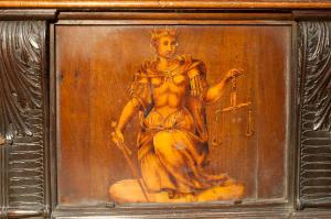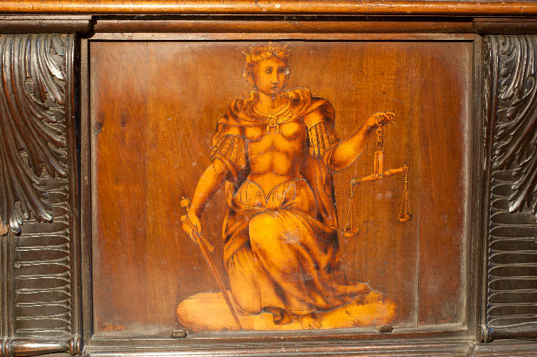 - NOTIZIE STORICO CRITICHE Nel 1522 il Consorzio della Misericordia Maggiore di Bergamo decise di dotare la basilica di Santa Maria di un nuovo coro e il 18 settembre di quell'anno deliberò di trattare con il legnaiolo e intarsiatore loverese Giovanni Francesco Capoferri per l'esecuzione dell'opera. L'artefice era noto a Bergamo fin dall'anno precedente per aver collaborato con fra' Damiano Zambelli all'esecuzione del coro intarsiato nella chiesa domenicana di Santo Stefano (ora in San Bartolomeo), inoltre nel 1522 il pittore Lorenzo Lotto gli aveva fatto tradurre in tarsia un suo disegno dell'Annunciazione (poi inserita nel bancale del celebrante, cfr. foto n. 904a) e questa dimostrazione aveva convinto il Consorzio ad affidare il lavoro al loverese. Al Capoferri, direttore dell'impresa del coro, fu affiancato il marangone Giovanni Belli di Ponteranica per i lavori di intaglio. Il principale teologo della città, fra Girolamo Terzi, fu incaricato di fornire le "inventiones" da dare ai pittori che avrebbero disegnato i cartoni da intarsiare.\nDopo aver acquisito alcuni cartoni forniti da pittori diversi, tra cui Lotto, Andrea Previtali, Francesco Rosso di Pavia, il 29 ottobre 1523 il Consorzio affidò i cartoni delle tarsie del coro al pressoché sconosciuto Nicolino Cabrini, che morì poco dopo. Il 12 marzo 1524 il Consorzio incaricò dunque Lorenzo Lotto di eseguire i disegni per le tarsie e dopo pochi mesi (2 giugno 1524) gli commissionò anche i pannelli intarsiati ("coperti") con imprese simboliche che dovevano proteggere le preziose tavolette. Lotto inizialmente effettuò anche la 'profilatura' delle tarsie, ovvero la loro rifinitura finale mediante stucco nero per i contorni delle figure e con ombreggiatura a fuoco per il chiaro-scuro, ma un contrasto di natura economica frenò la sua disponibilità. La profilatura fu allora effettuata dallo stesso Capoferri e dai pittori Andrea Previtali, Ludovico da Mantova e Lucano da Imola. Trasferitosi a Venezia nel dicembre del 1525, il pittore continuò a disegnare i cartoni delle tarsie e a inviarle a Bergamo fino al 1532, realizzando complessivamente 35 tarsie con storie bibliche di cui 4 grandi per l'iconostasi e 31 più piccole collocate oggi negli stalli del coro dei laici e nei due bancali del presbiterio; inoltre eseguì 32 tarsie a soggetto simbolico delle quali 28 costituivano i "coperti" delle tarsie istoriate e che oggi sono inserite negli schienali del coro degli ecclesiastici. \nNel 1531 si decise di ampliare la struttura del coro, trasferendo le tarsie istoriate del coro degli ecclesiastici al bancale del celebrante, a quello dei Rettori e al coro dei laici nell'abside, mentre nel coro dei religiosi rimasero i soli 'coperti' di soggetto simbolico: dei modelletti delle nuove strutture del presbiterio (bancali e coro dei laici) fu incaricato Marcantonio, figlio dell'architetto Pietro Isabello (1531-1532). Nell'ottobre del 1533, consegnati dal Capoferri gli ultimi pannelli intarsiati, risultano già collocate negli stalli del coro dei religiosi le tarsie 'simboliche' degli ex-coperti, mentre le altre tarsie istoriate rimasero per vent'anni nei depositi della Misericordia Maggiore. La fabbrica del coro fu ripresa nel 1547-1549 ma solo nel 1553-1555 i banchi della cappella maggiore furono portati a termine in base al modello elaborato dall'Isabello: nel 1553 fu chiamato a Bergamo Giovan Pietro Capoferri, fratellastro di Giovan Francesco, affermato intagliatore e intarsiatore, per la realizzazione del bancale del celebrante e della parte sinistra del coro dei laici, mentre ad Alessandro Belli, già attivo col padre nel coro degli ecclesiastici, furono assegnati il bancale dei Rettori, e la parte destra del coro dei laici. Nell'agosto del 1554 il bancale dei Rettori era quasi completato, giacché risulta che fu verniciato dal doratore Giacomo da Olera. Nelle tre spalliere furono inserite sei tarsie disegnate da Lotto e realizzate da Giovan Francesco Capoferri illustranti episodi dell'Antico Testamento. Nel basamen