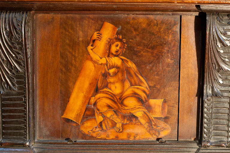 - NOTIZIE STORICO CRITICHE Nel 1522 il Consorzio della Misericordia Maggiore di Bergamo decise di dotare la basilica di Santa Maria di un nuovo coro e il 18 settembre di quell'anno deliberò di trattare con il legnaiolo e intarsiatore loverese Giovanni Francesco Capoferri per l'esecuzione dell'opera. L'artefice era noto a Bergamo fin dall'anno precedente per aver collaborato con fra' Damiano Zambelli all'esecuzione del coro intarsiato nella chiesa domenicana di Santo Stefano (ora in San Bartolomeo), inoltre nel 1522 il pittore Lorenzo Lotto gli aveva fatto tradurre in tarsia un suo disegno dell'Annunciazione (poi inserita nel bancale del celebrante, cfr. foto n. 904a) e questa dimostrazione aveva convinto il Consorzio ad affidare il lavoro al loverese. Al Capoferri, direttore dell'impresa del coro, fu affiancato il marangone Giovanni Belli di Ponteranica per i lavori di intaglio. Il principale teologo della città, fra Girolamo Terzi, fu incaricato di fornire le "inventiones" da dare ai pittori che avrebbero disegnato i cartoni da intarsiare.\nDopo aver acquisito alcuni cartoni forniti da pittori diversi, tra cui Lotto, Andrea Previtali, Francesco Rosso di Pavia, il 29 ottobre 1523 il Consorzio affidò i cartoni delle tarsie del coro al pressoché sconosciuto Nicolino Cabrini, che morì poco dopo. Il 12 marzo 1524 il Consorzio incaricò dunque Lorenzo Lotto di eseguire i disegni per le tarsie e dopo pochi mesi (2 giugno 1524) gli commissionò anche i pannelli intarsiati ("coperti") con imprese simboliche che dovevano proteggere le preziose tavolette. Lotto inizialmente effettuò anche la 'profilatura' delle tarsie, ovvero la loro rifinitura finale mediante stucco nero per i contorni delle figure e con ombreggiatura a fuoco per il chiaro-scuro, ma un contrasto di natura economica frenò la sua disponibilità. La profilatura fu allora effettuata dallo stesso Capoferri e dai pittori Andrea Previtali, Ludovico da Mantova e Lucano da Imola. Trasferitosi a Venezia nel dicembre del 1525, il pittore continuò a disegnare i cartoni delle tarsie e a inviarle a Bergamo fino al 1532, realizzando complessivamente 35 tarsie con storie bibliche di cui 4 grandi per l'iconostasi e 31 più piccole collocate oggi negli stalli del coro dei laici e nei due bancali del presbiterio; inoltre eseguì 32 tarsie a soggetto simbolico delle quali 28 costituivano i "coperti" delle tarsie istoriate e che oggi sono inserite negli schienali del coro degli ecclesiastici. \nNel 1531 si decise di ampliare la struttura del coro, trasferendo le tarsie istoriate del coro degli ecclesiastici al bancale del celebrante, a quello dei Rettori e al coro dei laici nell'abside, mentre nel coro dei religiosi rimasero i soli 'coperti' di soggetto simbolico: dei modelletti delle nuove strutture del presbiterio (bancali e coro dei laici) fu incaricato Marcantonio, figlio dell'architetto Pietro Isabello (1531-1532). Nell'ottobre del 1533, consegnati dal Capoferri gli ultimi pannelli intarsiati, risultano già collocate negli stalli del coro dei religiosi le tarsie 'simboliche' degli ex-coperti, mentre le altre tarsie istoriate rimasero per vent'anni nei depositi della Misericordia Maggiore. La fabbrica del coro fu ripresa nel 1547-1549 ma solo nel 1553-1555 i banchi della cappella maggiore furono portati a termine in base al modello elaborato dall'Isabello: nel 1553 fu chiamato a Bergamo Giovan Pietro Capoferri, fratellastro di Giovan Francesco, affermato intagliatore e intarsiatore, per la realizzazione del bancale del celebrante e della parte sinistra del coro dei laici, mentre ad Alessandro Belli, già attivo col padre nel coro degli ecclesiastici, furono assegnati il bancale dei Rettori, e la parte destra del coro dei laici. Nell'agosto del 1554 il bancale dei Rettori era quasi completato, giacché risulta che fu verniciato dal doratore Giacomo da Olera. Nelle tre spalliere furono inserite sei tarsie disegnate da Lotto e realizzate da Giovan Francesco Capoferri illustranti episodi dell'Antico Testamento. Nel basamen