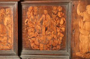 - NOTIZIE STORICO CRITICHE Nel 1522 il Consorzio della Misericordia Maggiore di Bergamo decise di dotare la basilica di Santa Maria di un nuovo coro e il 18 settembre di quell'anno deliberò di trattare con il legnaiolo e intarsiatore loverese Giovanni Francesco Capoferri per l'esecuzione dell'opera. L'artefice era noto a Bergamo fin dall'anno precedente per aver collaborato con fra' Damiano Zambelli all'esecuzione del coro intarsiato nella chiesa domenicana di Santo Stefano (ora in San Bartolomeo), inoltre nel 1522 il pittore Lorenzo Lotto gli aveva fatto tradurre in tarsia un suo disegno dell'Annunciazione (poi inserita nel bancale del celebrante, cfr. foto n. 904a) e questa dimostrazione aveva convinto il Consorzio ad affidare il lavoro al loverese. Al Capoferri, direttore dell'impresa del coro, fu affiancato il marangone Giovanni Belli di Ponteranica per i lavori di intaglio. Il principale teologo della città, fra Girolamo Terzi, fu incaricato di fornire le "inventiones" da dare ai pittori che avrebbero disegnato i cartoni da intarsiare.\nDopo aver acquisito alcuni cartoni forniti da pittori diversi, tra cui Lotto, Andrea Previtali, Francesco Rosso di Pavia, il 29 ottobre 1523 il Consorzio affidò i cartoni delle tarsie del coro al pressoché sconosciuto Nicolino Cabrini, che morì poco dopo. Il 12 marzo 1524 il Consorzio incaricò dunque Lorenzo Lotto di eseguire i disegni per le tarsie e dopo pochi mesi (2 giugno 1524) gli commissionò anche i pannelli intarsiati ("coperti") con imprese simboliche che dovevano proteggere le preziose tavolette. Lotto inizialmente effettuò anche la 'profilatura' delle tarsie, ovvero la loro rifinitura finale mediante stucco nero per i contorni delle figure e con ombreggiatura a fuoco per il chiaro-scuro, ma un contrasto di natura economica frenò la sua disponibilità. La profilatura fu allora effettuata dallo stesso Capoferri e dai pittori Andrea Previtali, Ludovico da Mantova e Lucano da Imola. Trasferitosi a Venezia nel dicembre del 1525, il pittore continuò a disegnare i cartoni delle tarsie e a inviarle a Bergamo fino al 1532, realizzando complessivamente 35 tarsie con storie bibliche di cui 4 grandi per l'iconostasi e 31 più piccole collocate oggi negli stalli del coro dei laici e nei due bancali del presbiterio; inoltre eseguì 32 tarsie a soggetto simbolico delle quali 28 costituivano i "coperti" delle tarsie istoriate e che oggi sono inserite negli schienali del coro degli ecclesiastici. \nNel 1531 si decise di ampliare la struttura del coro, trasferendo le tarsie istoriate del coro degli ecclesiastici al bancale del celebrante, a quello dei Rettori e al coro dei laici nell'abside, mentre nel coro dei religiosi rimasero i soli 'coperti' di soggetto simbolico: dei modelletti delle nuove strutture del presbiterio (bancali e coro dei laici) fu incaricato Marcantonio, figlio dell'architetto Pietro Isabello (1531-1532). Nell'ottobre del 1533, consegnati dal Capoferri gli ultimi pannelli intarsiati, risultano già collocate negli stalli del coro dei religiosi le tarsie 'simboliche' degli ex-coperti, mentre le altre tarsie istoriate rimasero per vent'anni nei depositi della Misericordia Maggiore. La fabbrica del coro fu ripresa nel 1547-1549 ma solo nel 1553-1555 i banchi della cappella maggiore furono portati a termine in base al modello elaborato dall'Isabello: nel 1553 fu chiamato a Bergamo Giovan Pietro Capoferri, fratellastro di Giovan Francesco, per la realizzazione del bancale del celebrante e della parte sinistra del coro dei laici, mentre ad Alessandro Belli, già attivo col padre nel coro degli ecclesiastici, furono assegnati il bancale dei Rettori, e la parte destra del coro dei laici. Nell'agosto del 1554 il bancale dei Rettori era quasi completato, giacché risulta che fu verniciato dal doratore Giacomo da Olera. Nelle tre spalliere furono inserite sei tarsie disegnate da Lotto e realizzate da Giovan Francesco Capoferri illustranti episodi dell'Antico Testamento. Nel basamento furono collocate inizialmente le tar