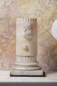 Vaso cilindrico, cavo nel mezzo. Base a forma di colonna scanalata. Al centro bassorilievo con busto maschile, rivolto a destra. Barba e capelli ricci, trattenuti da una coroncina.