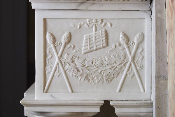 Coppia di tirsi incrociati, collegati da un festone di grappoli d'uva e sormontati da un flauto di pan legato con un fiocco.