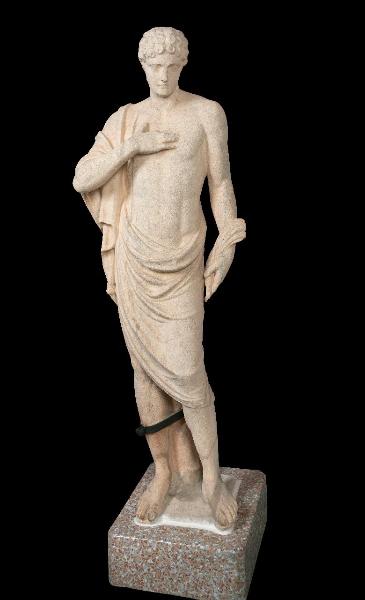 Figura maschile stante, avvolta in un peplo che lascia scoperto torso e piedi. Capelli corti e ricci. Braccio destro sollevato e portato al petto; il sinistro è steso lungo il fianco e regge la palma del martirio.