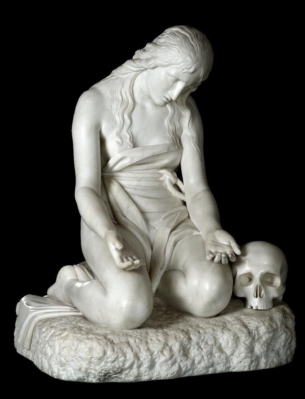 Figura femminile genuflessa con viso rivolto verso il basso. Le braccia sono distese sule cosce. Indossa un saio trattenuto in vita da una corda. Ha capelli lunghi e mossi. Accanto a lei, a sinistra, un teschio.