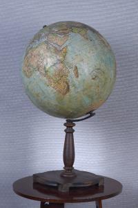 Rappresentazione fisica del globo terrestre, sorretta da una struttura in legno composta da un braccio arcuato, un perno e una base quadrata. La mappa è stampata su carta, applicata su una sfera di cartone.