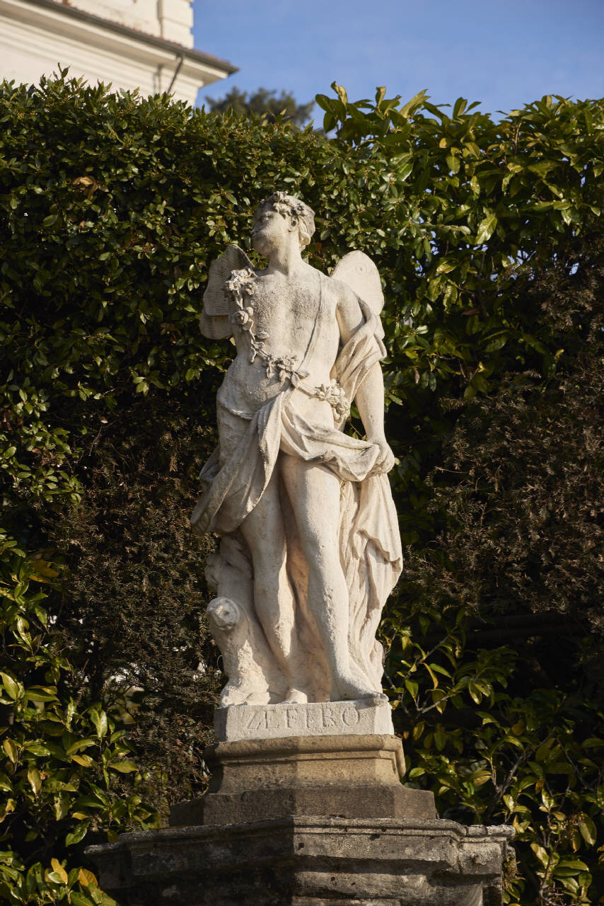 - NOTIZIE STORICO CRITICHE Si tratta di una delle dodici sculture che ornano la balaustra d'ingresso della villa che risultano documentate già nel XVIII secolo, come attestano le incisioni pubblicate da Marc' Antonio Dal Re nel volume "Ville di Delizia" (1743). Tuttavia, la resa grafica delle stampe non consente un'identificazione certa e inequivocabile con le statue attualmente in loco (Zanuso 2019). Per caratteri stilistici, le opere sono attribuibili allo scultore padovano Antonio Bonazza, assistito dalla sua bottega. L'iscrizione in lettere capitali incisa sul basamento consente di identificarla con "Zefiro". Questa figura rientra nelle rappresentazioni mitologiche presenti nella serie (Zanuso 2019).