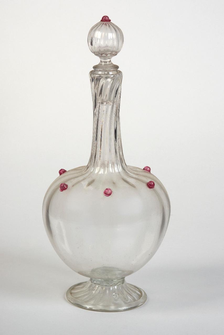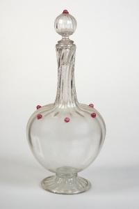 Bottiglia con collo lungo e sottile, rigonfia nella parte centrale e poggiante su un largo anello. È modellata con lunghe scannature e decorata con perline rosa in vetro lungo la pancia e sulla sommità del tappo.