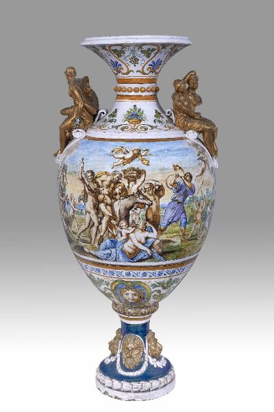 Vaso da esposizione a corpo ovoidale su alto piede e collo rastremato verso il centro; bocca a tromba. Sulle spalle due gruppi plastici con coppie mitologiche "all'antica", modellati a stampo e dorati; sul piede, snello e alto, inserimento di protomi leonine e teste di satiri a rilievo e dorati, circondati da festoni fogliati. Sulla fascia centrale e sul corpo ovoidale sono dipinte scene istoriate, festose, animate da figure classicheggianti. La cornice sul collo vede sottili girali fogliati legare grappoli d'uva e foglie di vite e vasi fioriti sulla spalla; il calice su fondo bianco mostra tondi con teste bacchiche frontali in cornici fogliate collegate da festoni fogliati.
