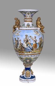 Vaso da esposizione a corpo ovoidale su alto piede e collo rastremato verso il centro; bocca a tromba. Sulle spalle due gruppi plastici con coppie mitologiche "all'antica", modellati a stampo e dorati; sul piede, snello e alto, inserimento di protomi leonine e teste di satiri a rilievo e dorati, circondati da festoni fogliati. Sulla fascia centrale e sul corpo ovoidale sono dipinte scene istoriate, festose, animate da figure classicheggianti. La cornice sul collo vede sottili girali fogliati legare grappoli d'uva e foglie di vite e vasi fioriti sulla spalla; il calice su fondo bianco mostra tondi con teste bacchiche frontali in cornici fogliate collegate da festoni fogliati.