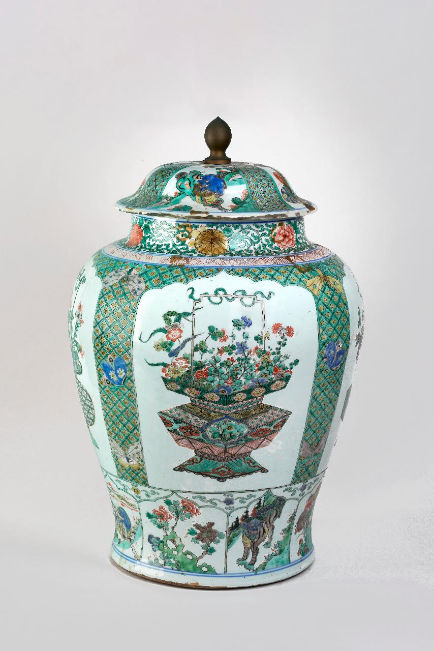 Grande vaso a balaustro, dalla forma "potiche", con corpo rigonfio alla spalla e piede leggermente svasato, basso collo cilindrico e coperchio a bassa calotta con presa superiore a pomello appuntito. L'ornato vede un fondo color verde con motivo a piccoli rombi e micro-fiori pentapetali, su cui volano grandi farfalle gialle blu e verdi. Quattro grandi riserve petaliformi presentano cesti di fiori diversi con peonie, crisantemi, fiori di loto. Alcuni cesti portano il simbolo "Shou" di longevità. Al piede corre una larga fascia di riserve petaliformi abitate da animali mitici, alternati a rocce con rami fioriti e farfalle in volo.