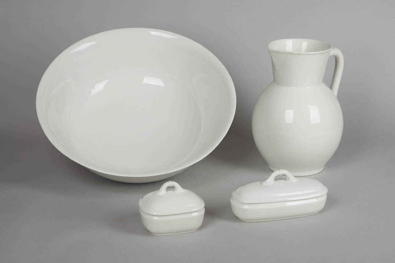 Servizio da lavabo in porcellana bianca. La parete spessa bianca è solo rivestita dalla vernice liscia vetrosa senza decorazioni nè plastiche nè pittoriche. Il servizio è composto da: quattro brocche, tre catini, cinque portaspazzolini e tre portasaponi.