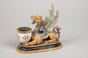 Calamaio di maiolica con animale con corpo felino, ampie ali e muso di cucciolo di drago con bocca aperta, posto su stretta base allungata, con lati minori semicircolari, dipinto in policromia. L'animale sdraiato tra le zampe anteriori tiene un piccolo vaso ogivale (con altro piccolo vaso conico inseribile). E' decorato in policromia con colori a gran fuoco industriali.