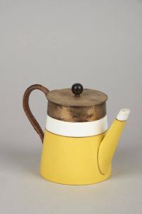 Il corpo della teiera è a tronco di cono; semplici fasce metalliche profilano, proteggendoli, alcuni orli superiori del materiale ceramico. Il coperchio è in metallo, sormontato da un piccola sfera come presa; il manico è rivestito dall'intreccio di sottilissime fasce di cuoio.