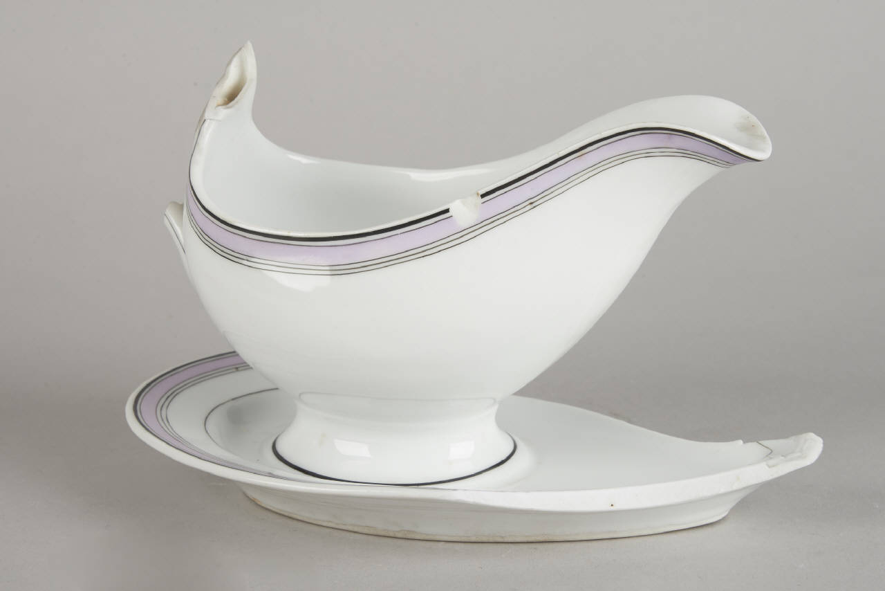 Salsiera in porcellana bianca. La decorazione vede correre sottili filetti neroi a sottolineare gli stretti nastri colorati in monocromia su diversi accenti cromatici rosa - viola che corrono sui rigonfiamenti plastici.