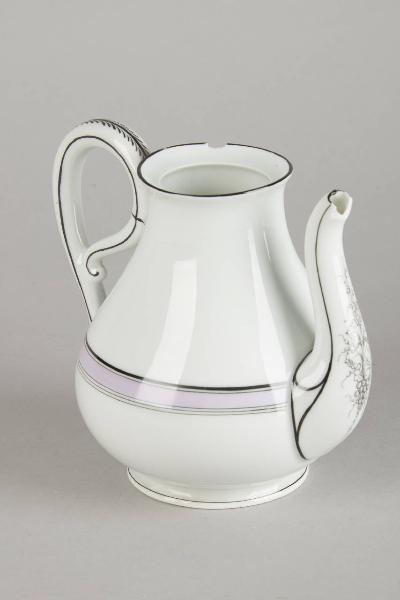Caffettiera in porcellana bianca. La decorazione vede correre sottili filetti neroi a sottolineare gli stretti nastri colorati in monocromia su diversi accenti cromatici rosa - viola che corrono sui rigonfiamenti plastici.