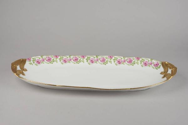 Pesciera con sottile rilievo plastico figurante la proiezione delle anse di gusto barocco. L'ornato è costituito da rose di colore rosa, legate tra loro da un filo fogliato a volute e pendoni (di diverso disegno) in monocromia verde pisello; gli orli e i passaggi di piano sono sottolineati da fili d'oro.