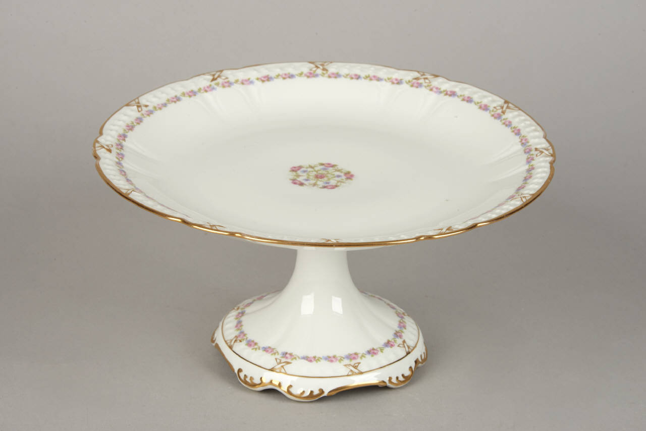 Alzata con un motivo a nastro floreale in sottile rilievo. Da questo si sviluppa il decoro pittorico a decalcomania con un sottile catenella di roselline, "non-ti-scordar-di-me" e fogliette. L'orlo è dorato.