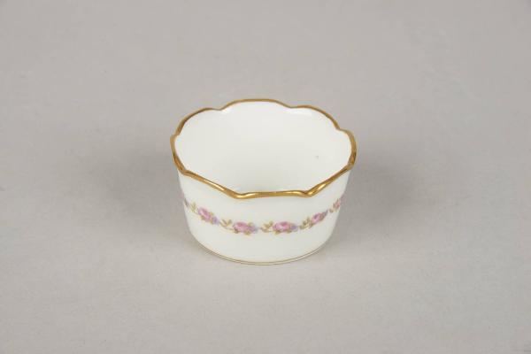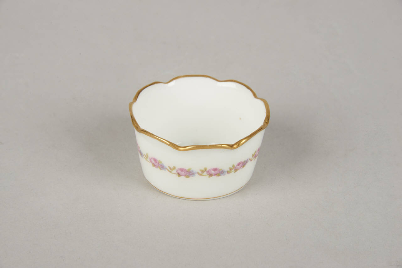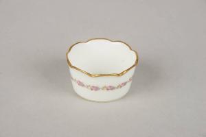 Vaschetta polilobata con un motivo a nastro floreale in sottile rilievo. Da questo si sviluppa il decoro pittorico a decalcomania con un sottile catenella di roselline, "non-ti-scordar-di-me" e fogliette. L'orlo è dorato.