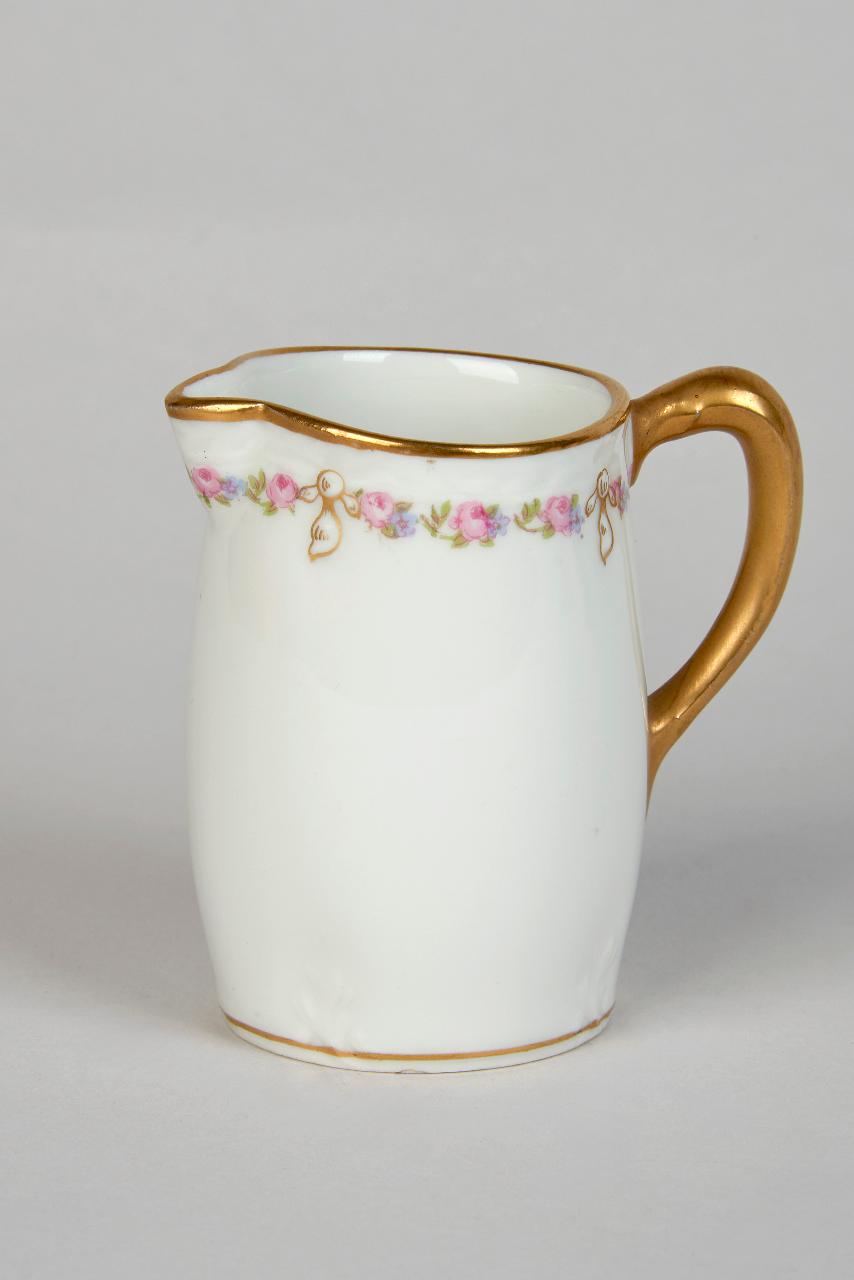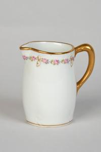 Lattiera con un motivo a nastro floreale in sottile rilievo. Da questo si sviluppa il decoro pittorico a decalcomania con un sottile catenella di roselline, "non-ti-scordar-di-me" e fogliette. L'orlo è dorato.