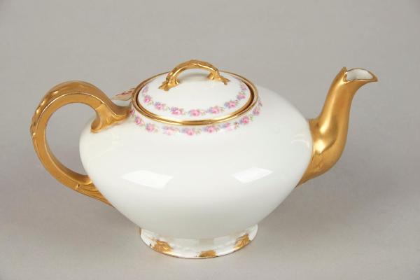 Teiera con coperchio e un motivo a nastro floreale in sottile rilievo. Da questo si sviluppa il decoro pittorico a decalcomania con un sottile catenella di roselline, "non-ti-scordar-di-me" e fogliette. L'orlo è dorato.