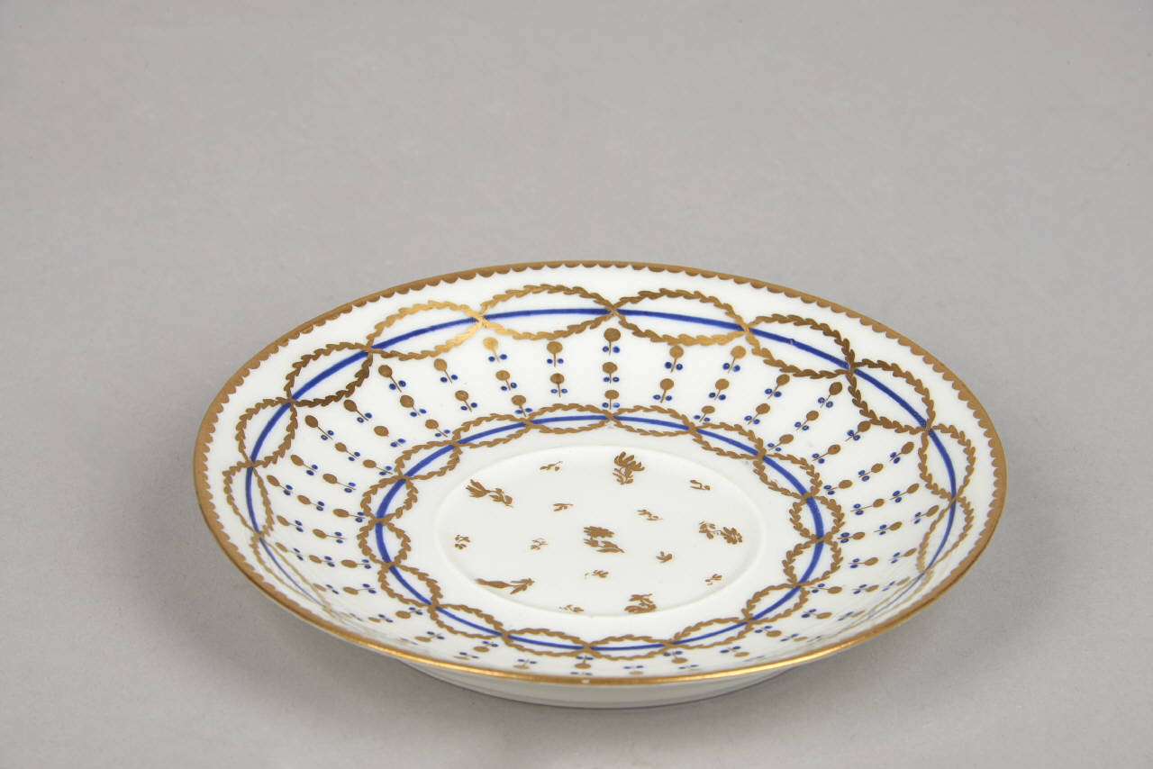 Piattino da thè a orlo liscio, leggermente rialzato, su base sottile ad anello.Il motivo decorativo è in bicromia blu e oro; due cerchi disegnati con filetti blu "Roi" reggono un motivo a linee ondulate fogliate d'oro che, incrociandosi, formano catene di ovali appuntiti, legate da linee puntinate radiali blu e oro.