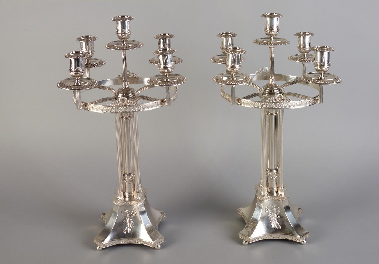 Candelabro a cinque bracci con fusto a colonna affiancato da quattro colonnine reggenti i portacandela. Base a quattro lati trapezoidali poggianti su sferette e decorata con applicazioni metalliche raffiguranti figure mitologiche femminili.