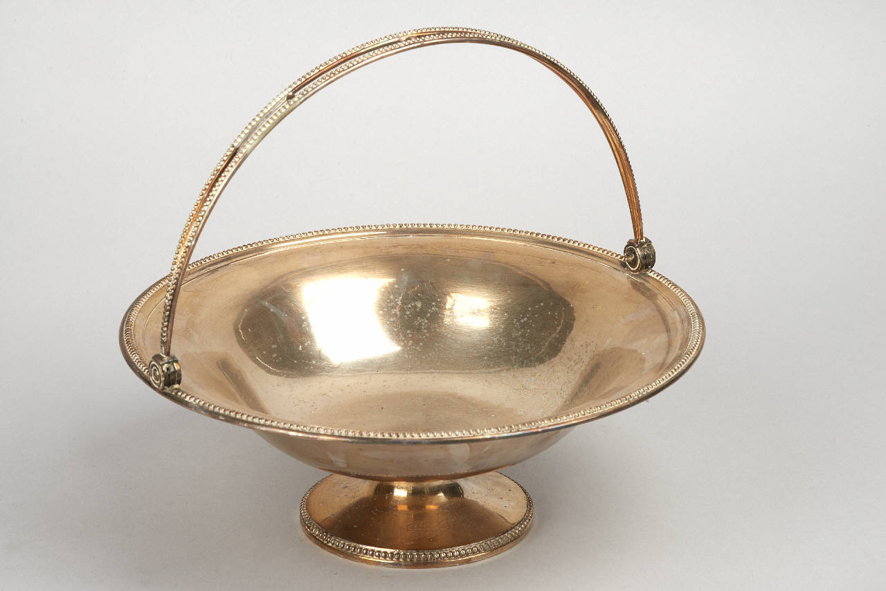 Portadolci con piede circolare e manico. Lungo i profili del manico, del piede e dell'invaso corre una decorazione a sferette.