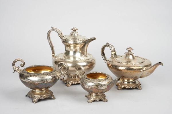 Servizio da caffè e da thè in argento Sheffield plate composto da caffettiera, teiera, lattiera e zuccheriera.