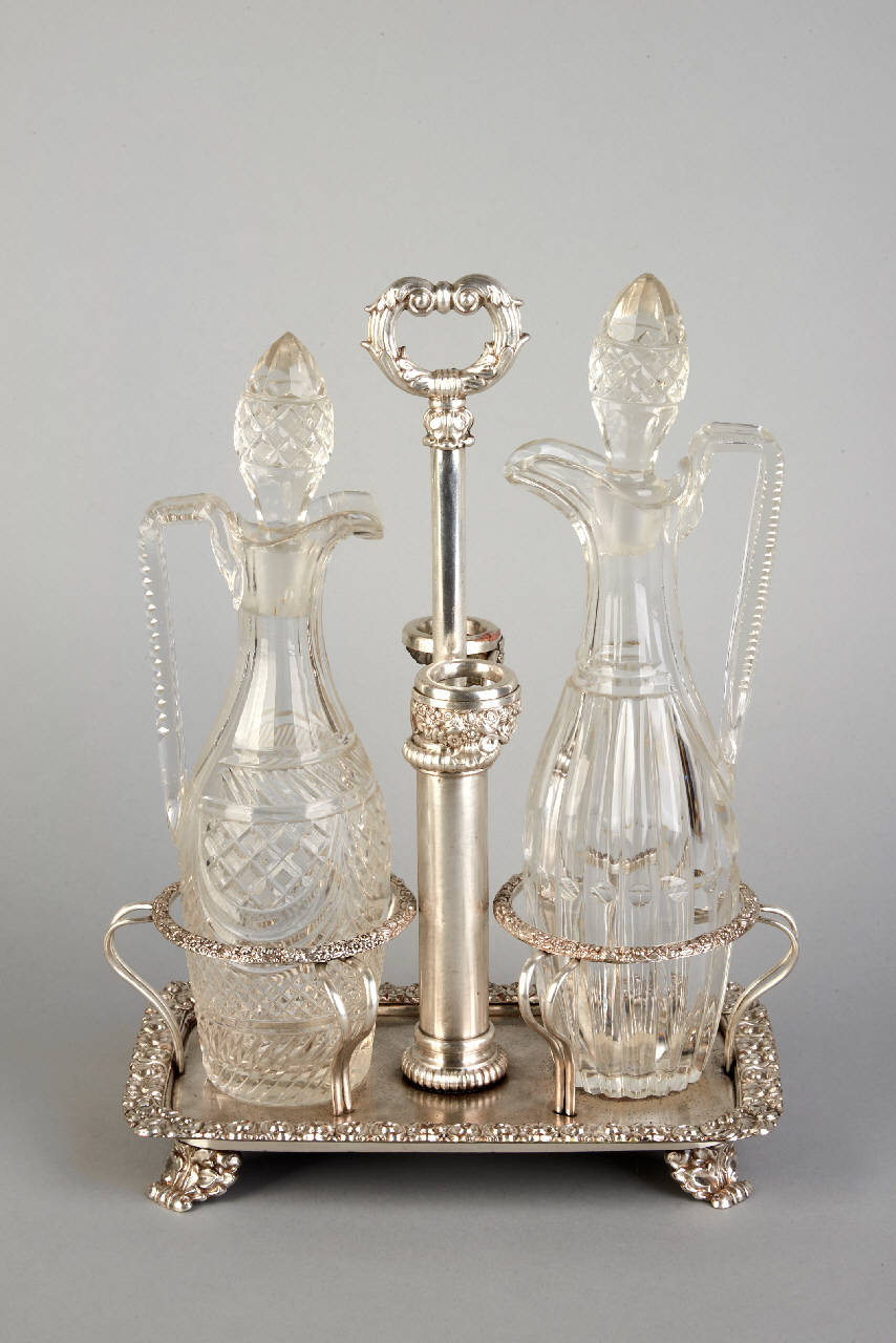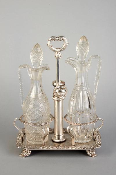 Servizio di olio e aceto costituito da due recipienti in vetro con manici, conclusi da tappo ovale, inseriti entro struttura metallica rettangolare, argentata e decorata con ornati fitomorfi.